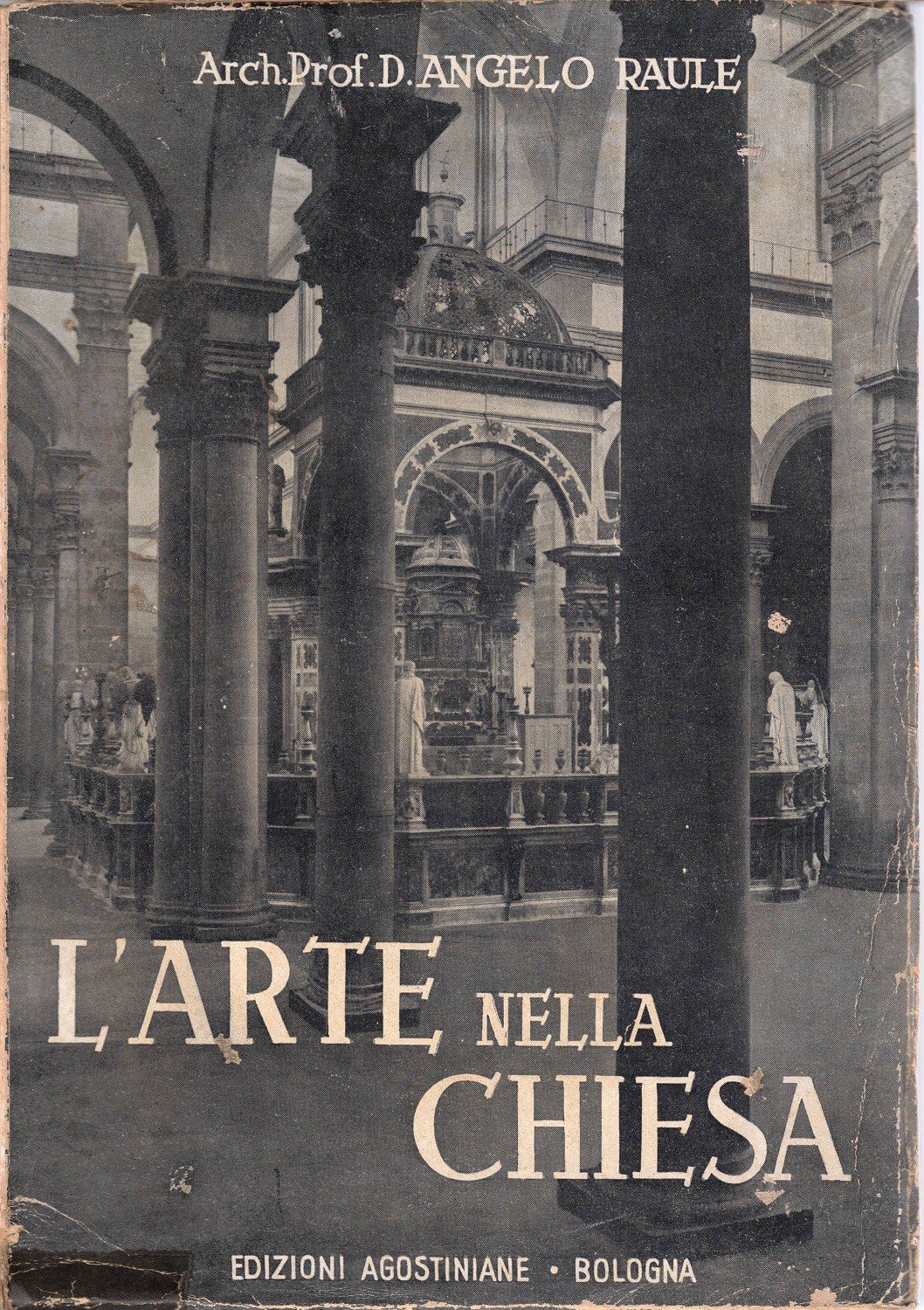 Angelo Raule, L’arte nella chiesa, Edizioni Agostiniane, Bologna 1953, pp. 280, 46 c. di tavv. f.t. ill. b.n., cm 25, br. ed. Ordinarie tracce d’uso, alcune sottolineature e annotazioni a matita ma non deturpanti, usuali segni del tempo, per il resto e nel complesso buon esemplare, con interno ben tenuto e di piena fruibilità e brossura solida.