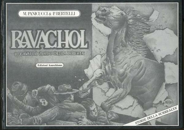 50 p. : ill. ; 24 x 33 cm. Storie della surrealtà. Ravachol è una storia di ribellione ambientata nella Piombino degli anni ’50, raccontata in forma di fumetto con numerose citazioni letterarie, fotografiche e cinematografiche; protagonista del libro, scritto da Pino Bertelli e disegnato da Massimo Panicucci, è Ravachol (dal criminale anarchico francese dell’800), un cavallo che si rivolterà contro il suo destino di morte fino all’ultimo, allegoria della libertà più irriducibile. Legatura editoriale, coperta illustrata (b/n) in cartoncino rigido plastificato lucido. All'interno tavole in b/n su carta patinata opaca. Codice libreria 7618.