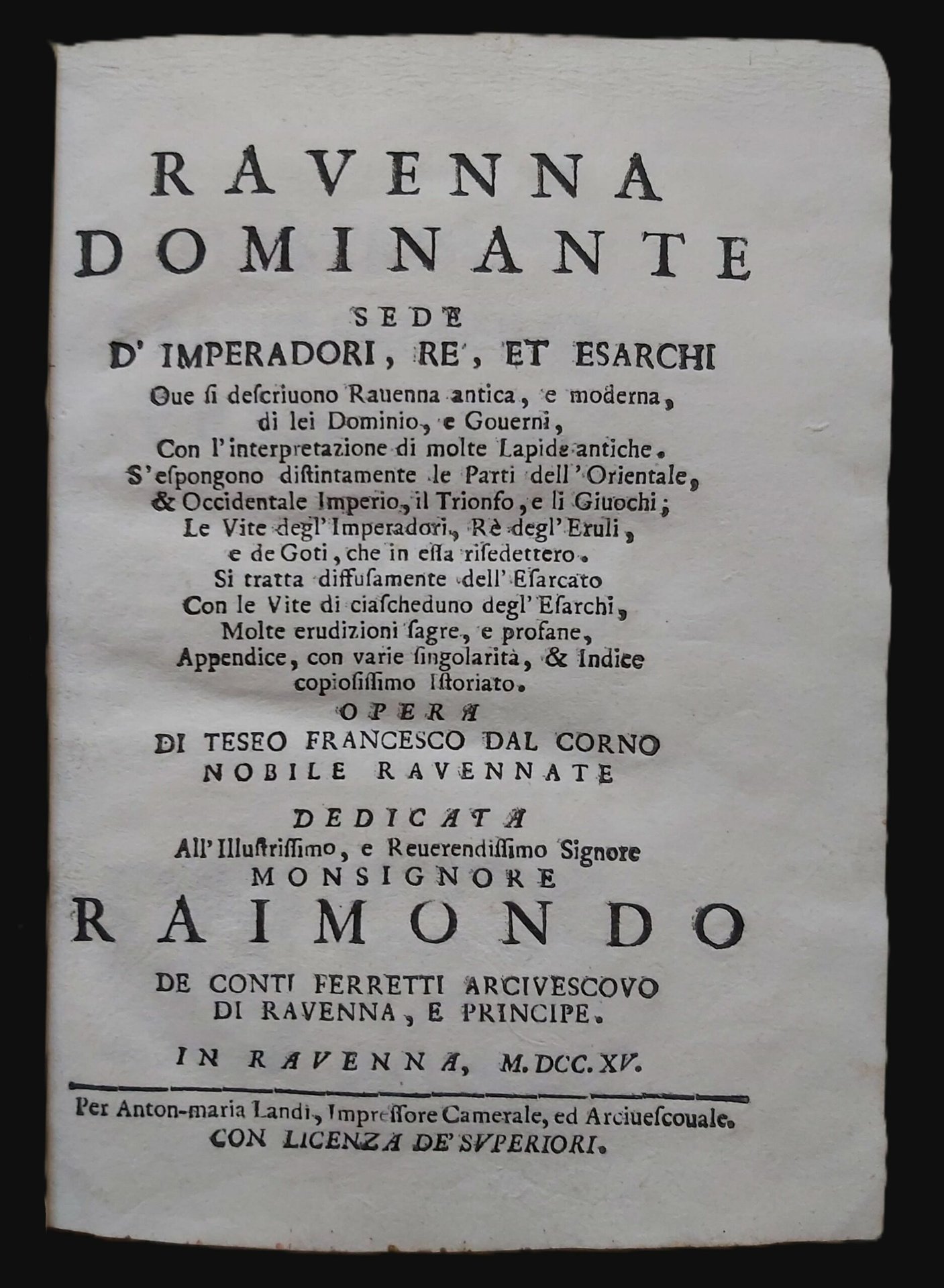 RAVENNA DOMINANTE sede d’Imperatori, Re et Esarchi. Ove si descrivono Ravenna antica e moderna, di lei dominio, e governi, con l’interpretazione di molte lapidi antiche. S’espongono distintamente le parti dell’orientale, e occidentale Imperio, il trionfo, e li giuochi, le vite degl’imperatori, re degli Eruli, e de’ Goti, che in essa risiedettero. Si tratta diffusamente dell’esarcato colle vite di ciascheduno degli Esarchi, molte erudizioni sagre, e profane. Appendice, con varie singolarità, e indice copiosissimo istoriato. Opera di. Nobile Ravennate. Dedicata a Mons. Raimondo dei Conti Ferretti Arcivescovo di Ravenna e Principe.
