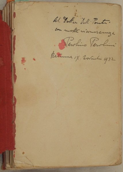 In 8. cm 22,5x15,5. Pp. VI+407+(5). Bellissimo volume del 1912 su Ravenna scritto dallo storico e politico ravennate Pier Desiderio Pasolini (1844-1920). L'autore descrive la storia della città attraverso i personaggi che la predilissero: Cesare, Galla Placidia, Onoria, Teodorico, Amalasunta, Giustiniano e Teodora, Carlomagno, Dante, La battaglia di Ravenna, Napoleone, Byron, Giuseppe e Anita Garibaldi. All'interno sono presenti numerose foto che mostrano vedute e oggetti e planches fuori testo. Dedica di Pasolino Pasolini datata 1932 alla prima carta bianca. In discrete condizioni. Copertina editoriale in mediocri condizioni generali con usure ai margini e dorso. Piatto anteriore staccato e dorso quasi assente. Legatura quasi assente. All'interno le pagine si presentano in ottime condizioni. Very beautiful volume of 1912 about Ravenna written by the historian and politician from Ravenna Pier Desiderio Pasolini (1844-1920). The author describes the history of the city through important people who loved it: Cesare, Galla Placidia, Onoria, Teodorico, Amalasunta, Giustiniano e Teodora, Carlomagno, Dante, La battaglia di Ravenna, Napoleone, Byron, Giuseppe and Anita Garibaldi. Inside there are different photoes and out of text planches showing views and items. Dedication of Pasolino Pasolini dated 1932 in the first blank page. In fair conditions. Editorial cover in poor general conditions with wearings in the edges and spine. Front plate detached and spine almost missing. Binding is almost missing. Inside pages are in very good conditions.