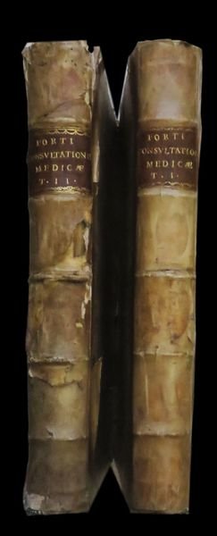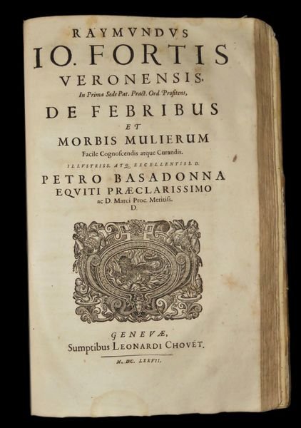 In 2° (34x21 cm); due tomi: (12), 483, (25), (8), 114, (14) pp. e (20), 615, (53) pp. Legature coeve in piena pergamena con dorso a 5 nervi e titolo in oro ai tasselli su fascetta in pelle. Qualche difetto e segno del tempo alla legatura. Allinterno del primo volume bruniture sparse dovute alla qualità della carta utilizzata e per il resto in buone condizioni di conservazione. Antica nota di possesso privato alla prima carta bianca Del Sig.r Cap.o Gardini. Al frontespizio, stampato in rosso e nero, bella marca tipografica di Leonardo Chouet con Salamandra tra le fiamme in cornice figurata. Il primo volume contiene, come indicato sul front., e con proprio front.:Raymundi Io. Fortis Veronensis.De febribus et morbis mulierum facile cognoscendis atque curandis. Genevae: sumptibus Leonardi Chovet, MDCLXXVII. Bel ritratto dellautore allinizio de primo volume, opera di Francesco Diodati. Prima edizione, rara a reperirsi completa dei due volumi, di questo importante testo medico scritto dal celebre dottore veronese, Giovanni Raimondo Forti conosciuto anche con il cognome di Gianforti o Giansorti (1603-1678). Di umili origini, venne mantenuto agli studi grazie allinteressamento di un ricco concittadino. Ottenne la laurea in medicina presso lateneo padovano, praticò larte medica prima a Venezia e poi a Udine. Qui, in particolare, la sua fama di grande medico lo porta allattenzione delle autorità universitarie di Padova che decidono di assegnargli la cattedra di Medicina presso lateneo patavino. Nel 1676 è chiamato a Vienna dallImperatore Leopoldo Secondo come medico personale. Quando rientra in Italia viene nominato cavaliere di San Marco per i meriti scientifici. Forti è celebre in quanto fu tra i primi medici in Europa a praticare la trasfusione del sangue, come sottolineato da Wellcome vol III, p. 44 Forti was among the first medical men to experiment with blood transfusion in man in Europe. La pratica della trasfusione del sangue, utilizzata per la prima volta dal medico ufficiale di Luigi XIV, Jean-Baptiste Denys nel 1667, nonostante la morte del paziente in cura (al quale Denys trasfuse sangue animale), si diffuse in Europa e alcuni medici, fra i quali Forti provarono diverse volte a salvare i propri pazienti in condizioni critiche, proprio con le trasfusioni. I continui decessi portarono diversi stati a proibire la pratica che venne poi ripresa solo allinizio del XIX° secolo da James Blundell. Il primo volume di questopera uscì nel 1669 ma nel 1678, anno della morte di Forti lopera, integrata e corretta, venne ristampata. Apparve poi postuma la seconda parte, a se stante (tanto che molte bibliografie ritengono il secondo volume come opera a parte) che presenta e completa gli ultimi lavori di Forti, particolarmente legati, appunto, alla circolazione del sangue. Il primo volume è particolarmente importante per la sua parte ginecologica e di ostetricia. Rif. Bibl.: Per la prima prte Wellcomme III, 44; Krivatsy 4207; Biographie Médicale IV, 210; Eloy II, 69. Per la seconda parte ICCU IT\ICCU\LIAE\036682.