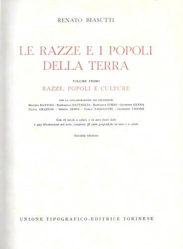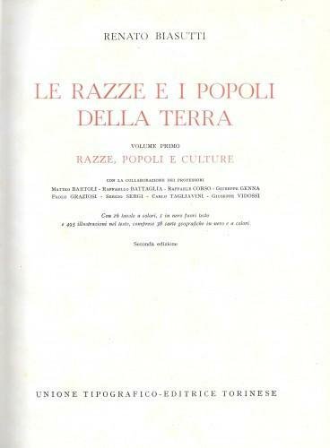 In 8°, pp. 723, 665, 720, 811; p/tela edit. verde con tit. oro. Con la collaborazione dei migliori studiosi dell'epoca. Vol. I: Razze, popoli e culture - Vol. II: Europa, Asia - Vol. III: Africa, Oceania - Vol. IV: America, Indici.; con migliaia di foto b/n e oltre 40 tavv. a colori ripiegate f.t. In ottimo stato. 170/27