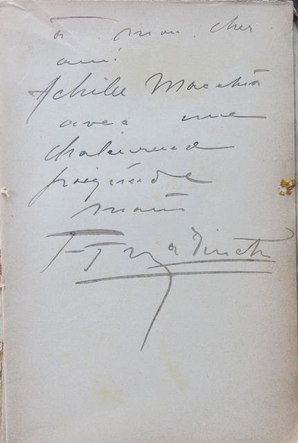 Fratelli Treves Editori, Milano 1910. In 8vo, pp. 268, bross. orig. in carta con ill. al piatto, coeva velina di protezione. Il dramma fu rappresentato per la prima volta al Teatro dell'Opera di Parigi il 3 aprile del 1909. Ampia dedica autografa di Marinetti a un certo Achille non meglio identificato alla prima bianca. Mancanze della carta al dorso e sciolto il piatto anteriore, normale ingiallimento del tempo con minime sporadiche fioriture, molto buono tutto l'interno. .