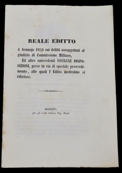 In 8°; 19, (1) pp. Senza brossura ma con legatura originale. Stemma ducale alla terza pagina. Prima rarissima edizione, quattro soli esemplari censiti in ICCU, di questo editto promulgato dal Duca Francesco V Ferdinando Geminiano d'Asburgo-Este (Modena, 1º giugno 1819 Vienna, 20 novembre 1875) appartenente alla linea Asburgo-Este, figlio maggiore del duca Francesco IV d'Asburgo-Este e della principessa Maria Beatrice di Savoia (1792-1840) che fu l'ultimo sovrano regnante del Ducato di Modena e Reggio. Leditto promulgato dal Duca era diretto a colpire possibili moti insurrezionali, ponendo i cospiratori sotto il giudizio della Commissione Militare. Si legge così che verranno giudicati da una Commissione Militare chiunque avesse messo in circolazione scritti, stampe, emblemi contrari al governo legittimo, chi avesse diffuso patenti settarie o cartelle di prestiti rivoluzionari, chi nascondesse armi atte ad offendere la sovranità del Duca, le aggressioni o invasioni armate al territorio del ducato, attentati, omicidi o i ferimenti avvenuti con intenti di sommossa, chi si unisce a bande armate di tre o più individui di mala fama, i possessori di armi e munizioni che non ne abbiano il permesso. Tali delitti porteranno a pene comprese da diversi anni di galera fino alla pena di morte per il solo capo delle bande armate o di tutti i membri nei casi più gravi. Con questo editto venivano, una volta emessi i giudizi, sciolte le Commissioni Militari istituite a Modena e Massa immediatamente dopo il fallimento dei moti del 1848, per essere sostituite da nuove commissioni che avrebbero seguito la nuova legislazione promulgata da Francesco V. Allallegato 1°, edito nel 1820 dal Supremo Consiglio di Giustizia presieduto dal Cancelliere Dott. G. B. Chiossi, si legge: In presenza dei ripetuti orribili attentati delle Sette segrete contro i legittimi Sovrani, e contro l?ordine pubblico e sociale; ed a prevenire le insidie che si tentassero contro le Forze destinate a mantenerlo, troviamo necessario di prendere le seguenti misure: . Rarissimo ed in ottime condizioni di conservazione. Rif. Bibl.: IT\ICCU\MOD\0849137.