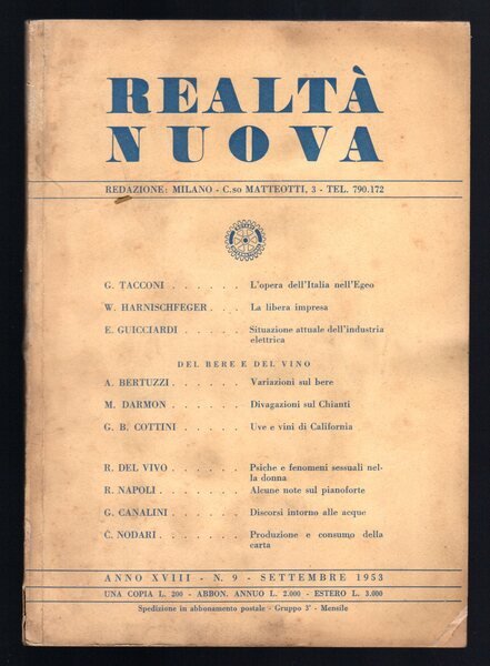 Opuscolo vintage. Anno XVIII - N. 9 - settembre 1953. Macchie in quarta di copertina e copertina, copertina parzialmente licenziata. Usura da scaffale. Evidente segno del tempo.