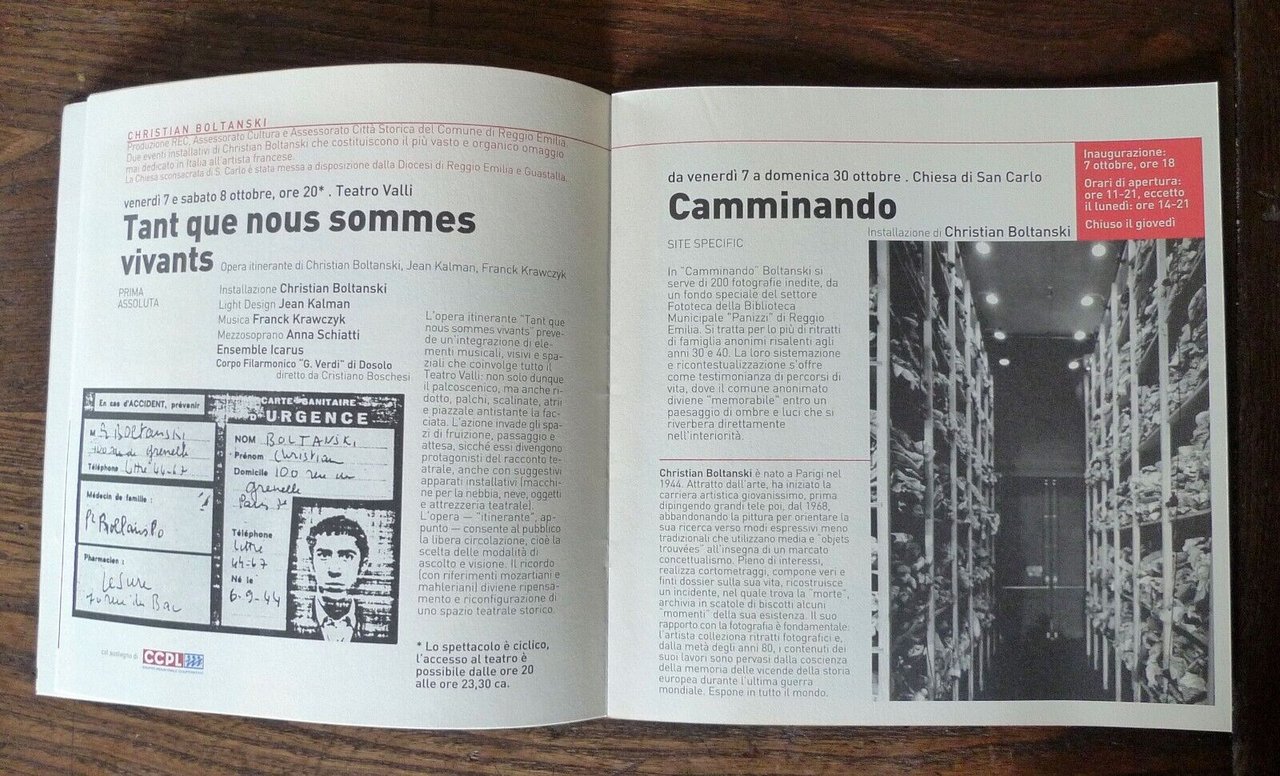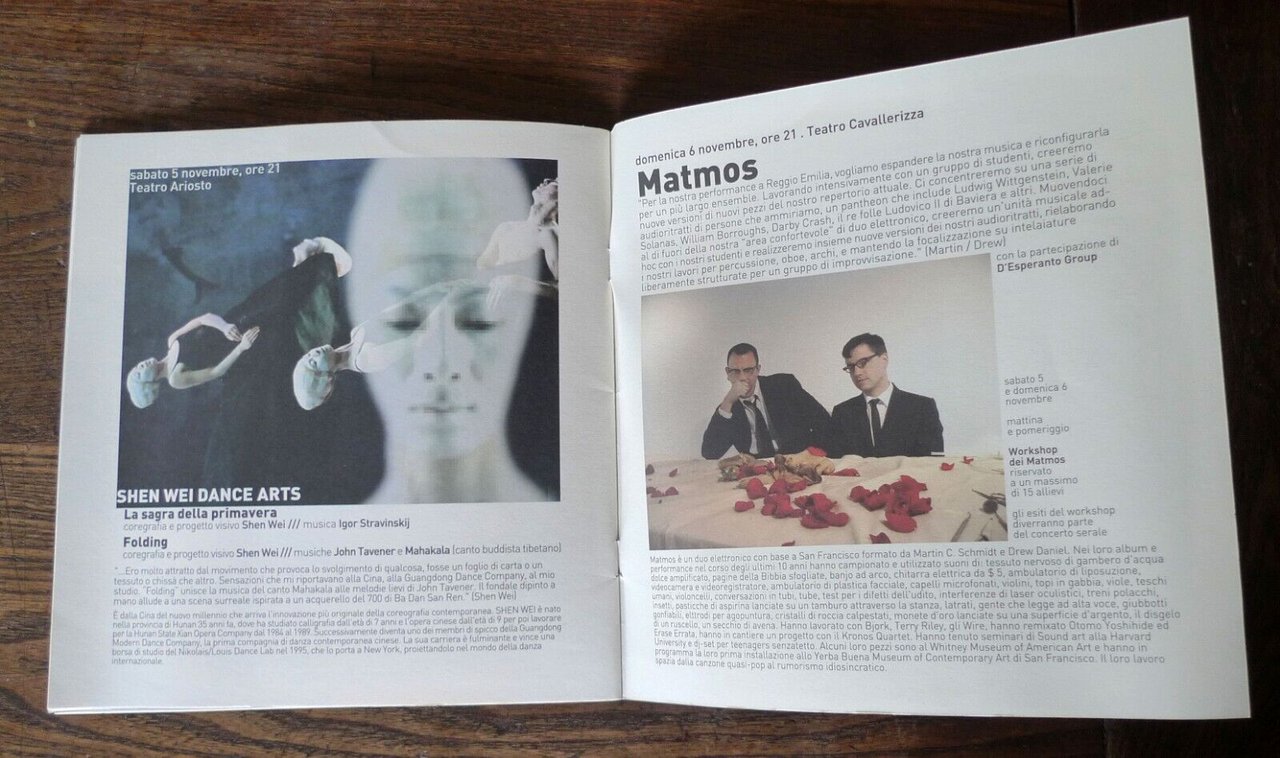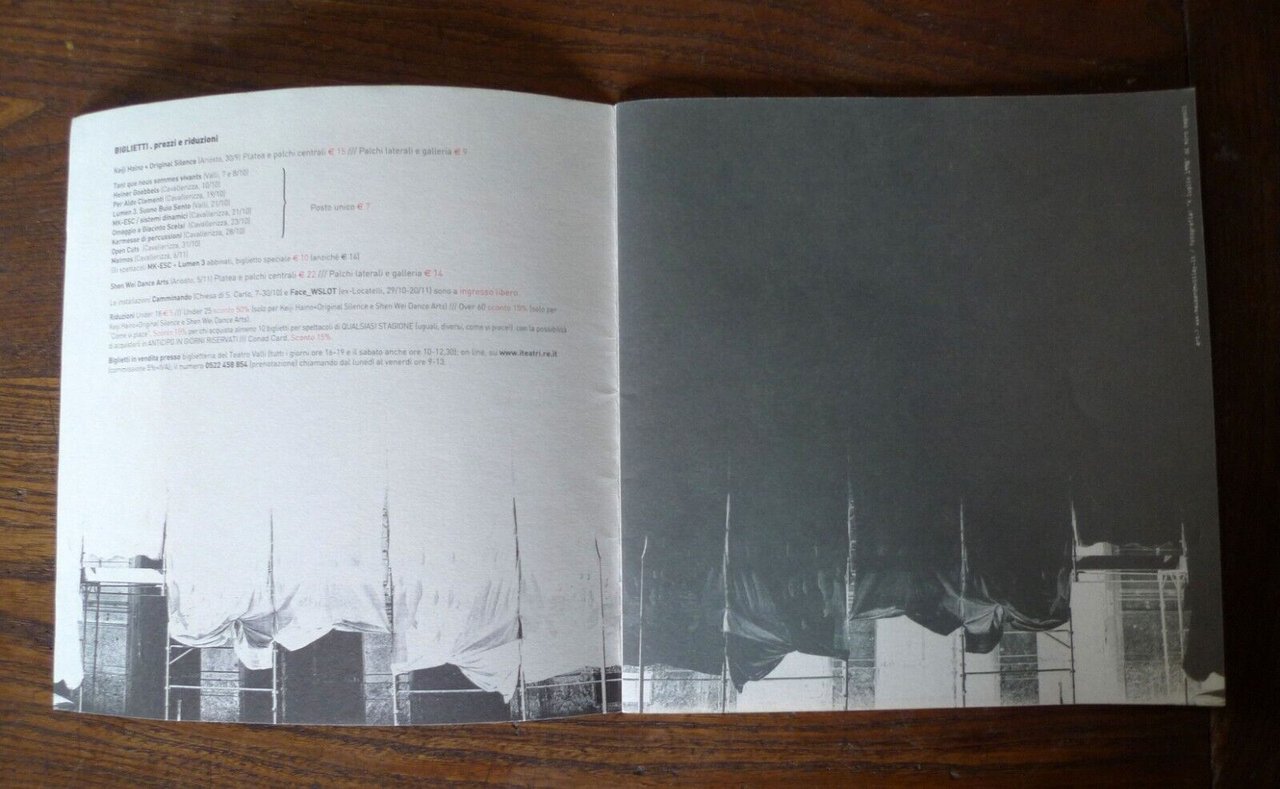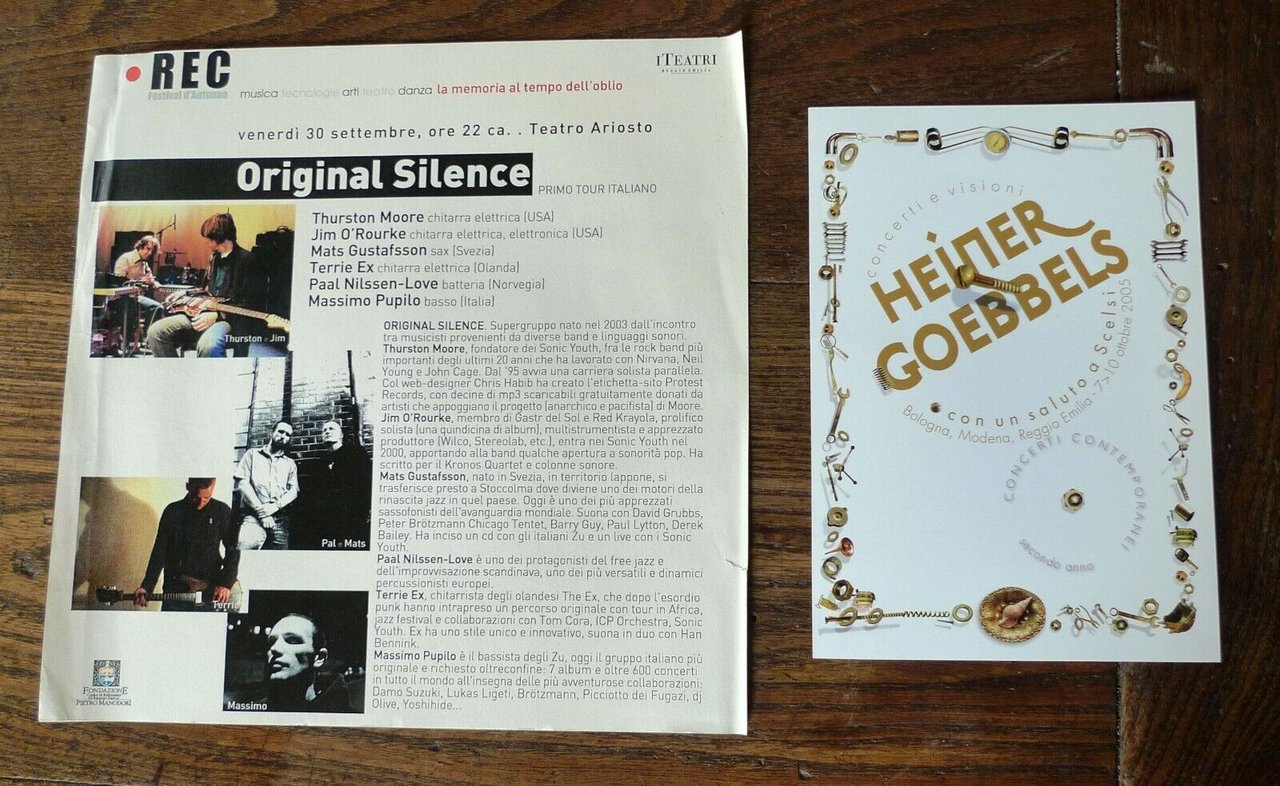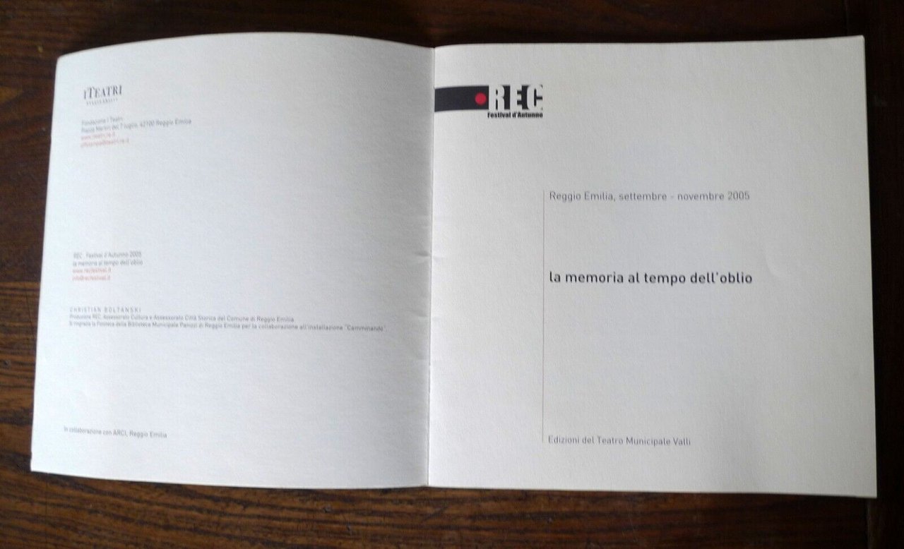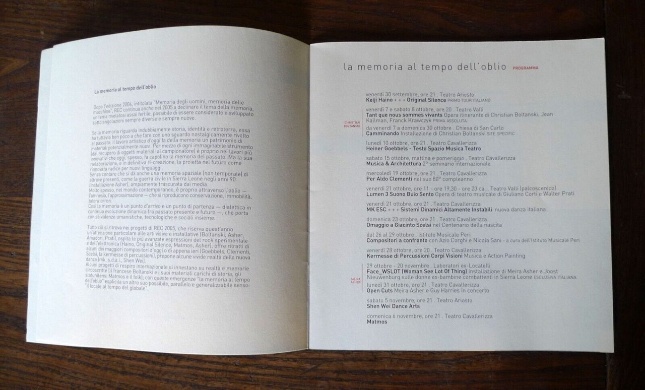 RECFESTIVAL D'AUTUNNO 2005.MUSICA TECNOLOGIE ARTI TEATRO DANZA.Reggio Emilia, settembre - novembre 2005.LA MEMORIA AL TEMPO DELL'OBLIO.Fondazione I Teatri / Edizioni del Teatro Municipale Valli, Reggio Emilia 2005,brossura, 21x20 cm., pp.22 non numerate,illustrazioni in nero e a colori,con un flyer/cartolina dedicato a Heiner Goebbelsed uno dedicato a Keiji Haino ed Original Silence,peso: g.200
