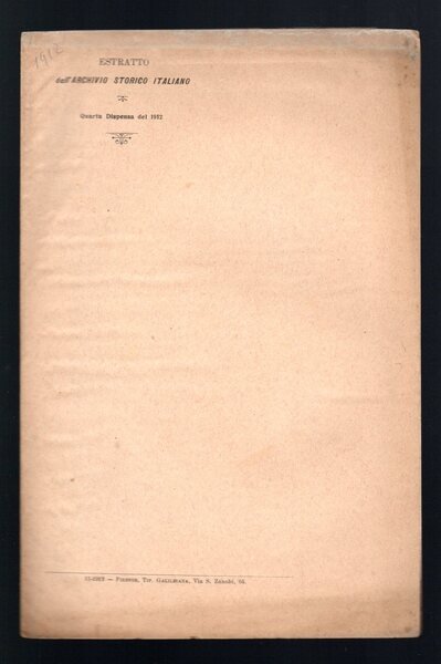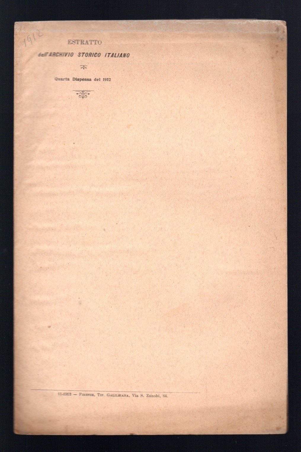 Opuscolo vintage. Estratto dall'Archivio Storico Italiano IV dispensa del 1912. Segni di matita in copertina. Usura da scaffale. Ordinario segno del tempo.