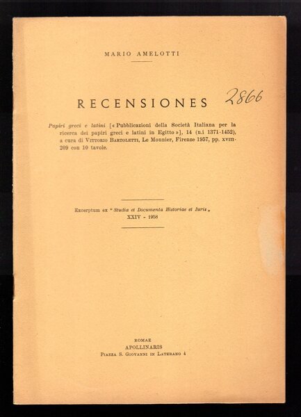 Opuscolo vintage. Papiri greci e latini, Pubblicazioni della Società Italiana per la ricerca dei papiri greci e latini in Egitto , 14 (n.i 1371-1452), a cura di VITTORIO BARTOLETTI, Le Monnier, Firenze 1957, pp. XVIII 209 . Excerptum ex Studia et Documenta Historiae et Iuris, XXIV - 1958. Dedica autografa dell'autore. Segni di biro in copertina. Usura da scaffale. Ordinario segno del tempo.