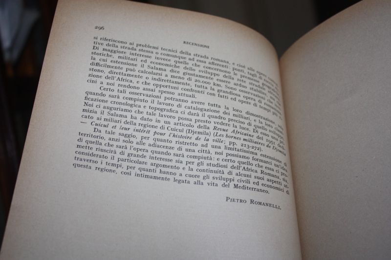 Codice 3685, UN FOGLO, SOLO RECENSIONI SU LES VOIS ROMAINES DE L'AFRIQUE DU NORD PREFACE DE L.LESCHI GOUVERNEMENT GENERAL DE L'ALGERIE DIRECTION DE L'INTERIUER ET DE BEAUX ARTS SERVICE DES ANTIQUITES MISSION ARCHEOLOGIQUE , UN FOGLIO SOLO DI RECENSIONI, FATTO DA PIETRO ROMANELLI
