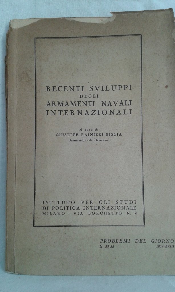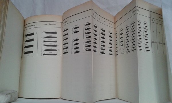 Fascicolo in 8, brossura editoriale, frontespizio, 45 pp., 15 grandi tavole ripiegate f.t. con tabelle e prospetti molto dettagliati riguardanti navi, sommergibili, pesi, ecc. Interessante opera pubblicata a conflitto in atto, mette in rapporto il tonnellagio da guerra gi in linea e quello in progetto delle nazioni belligeranti e neutrali qual'era in quel momento l'Italia. Il lavoro attento, il quadro presentato, efficace. Lievi mende e mancanze alla brossura, in pi che buono stato l'interno. Interessante documento.