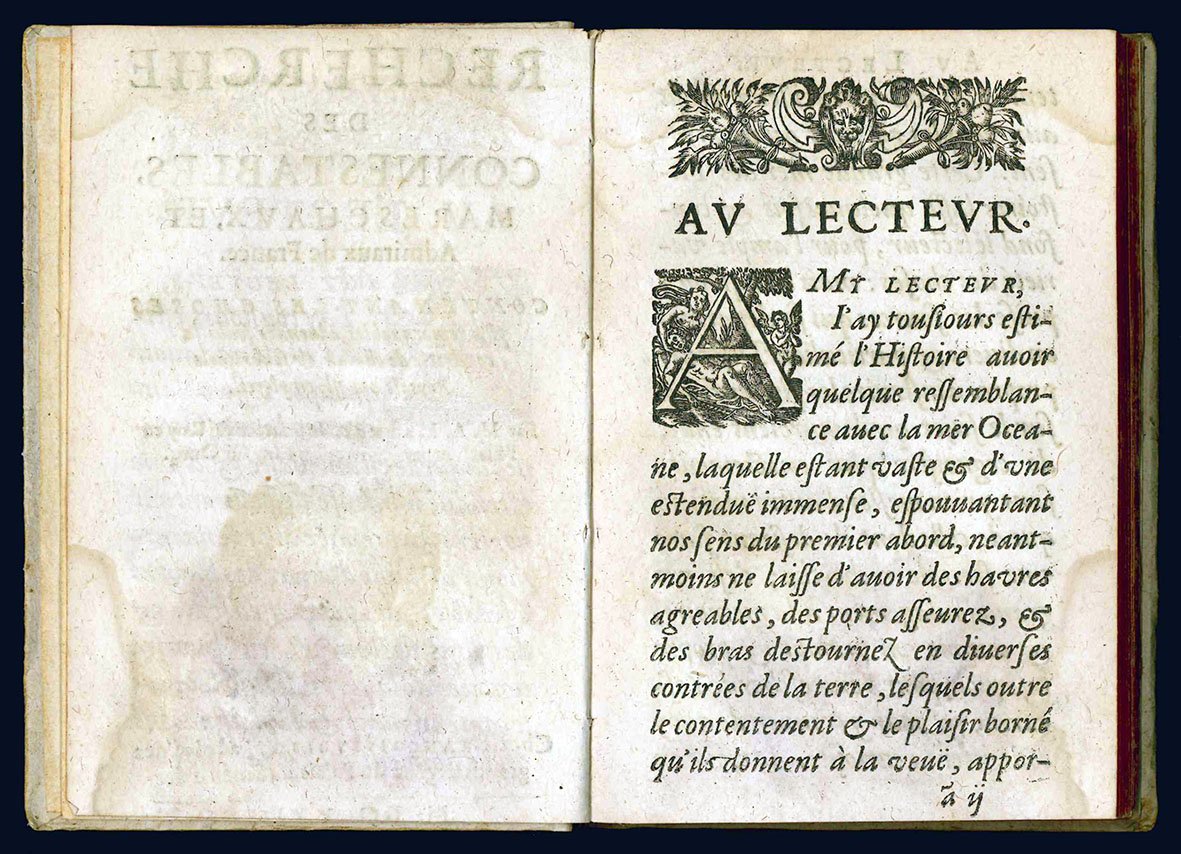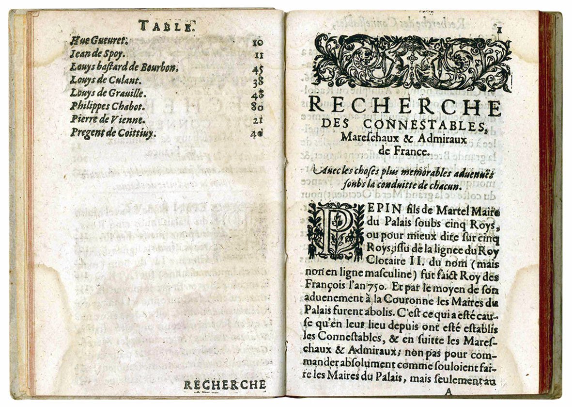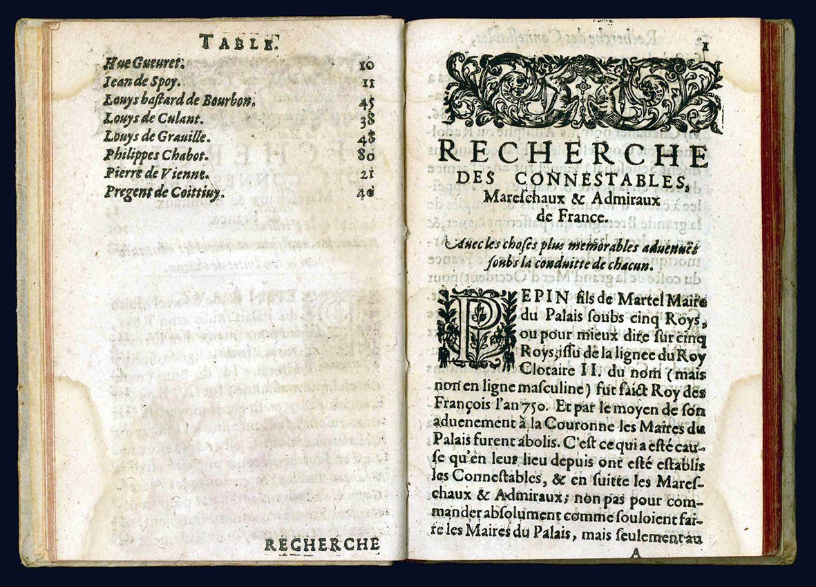 Recherche des connestables, mereschaux, et Admiraux de France. Contenant les choses plus remarquables advenues soubs la conduitte de chacum, & soubs quels Roys ils ont esté employez.