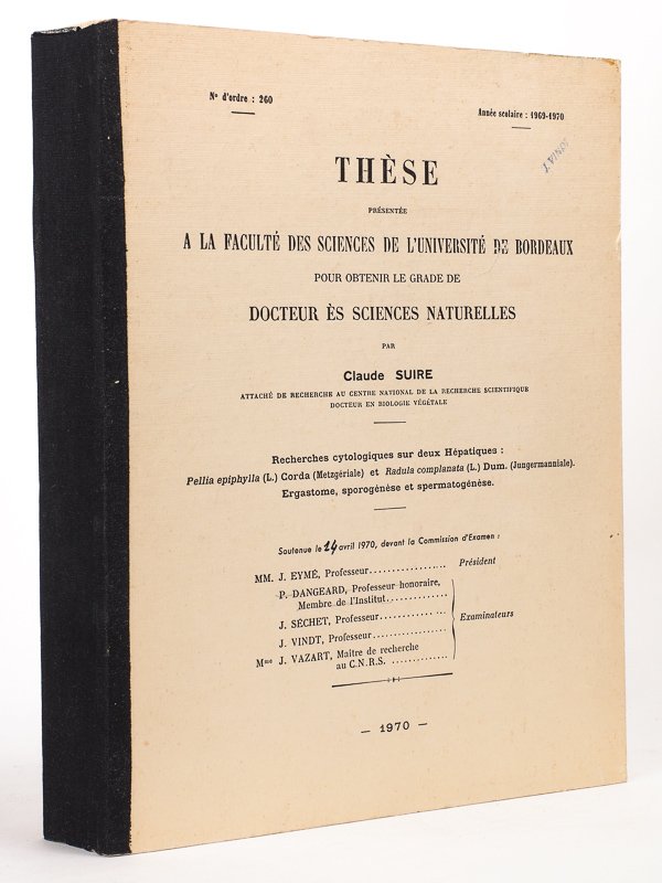 1 fort vol. in-4 polycopié, s.n., Bordeaux, 1970, 320 pp. + 37 pl. noir et blanc Bon état (petit cachet d'ex libris sur couv.) pour cet exemplaire de la thèse, à ne pas confondre avec le texte parue dans la revue "Le botaniste". Peu courant.