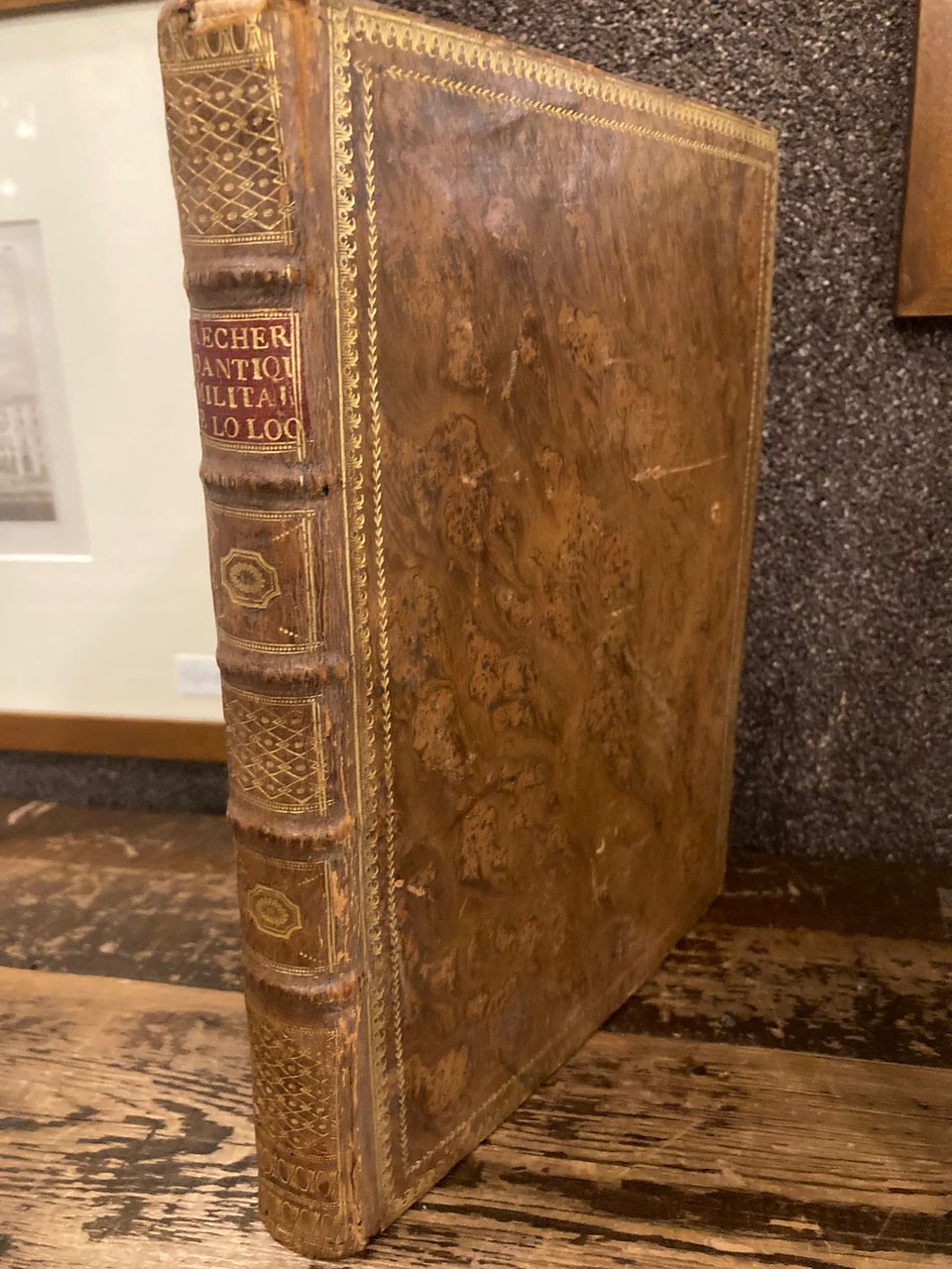 In-4° (262x205mm), pp. (2), XXIV, 226, (2), bella legatura coeva p. pelle marrone marmorizzata con duplice bordura ornamentale in oro ai piatti. Dorso a 5 nervi con titolo in oro su tassello rosso, ricchi motivi ornamentali in oro entro scomparti. 8 tavv. incise su rame e più volte ripiegate in fine. Ex-libris moderno. Qualche normale brunitura e fioritura. Bellissimo esemplare. Prima e unica edizione di questa disamina di molte importanti battaglie dell'antichità svolta con intenti apologetici nei riguardi di Folard contro le obiezioni mosse a quel trattatista dal Guischard, che reputava inutili gli studi sulla tecnica militare degli antichi alla luce dello sviluppo delle armi da fuoco e della cartografia Robert Lo de Radelet, noto con lo pseudonimo de Lo-Looz (Liegi, 1730-1786) combatté in gioventù al servizio della Svezia e poi, nel corso della Guerra dei Sette Anni, della madrepatria Francia. Cavaliere dell'Ordine di San Luigi,lasciò anche delle stimate Recherches sur l'art militaire, ou essai d'application de la fortification a la tractique. Marini, Biblioteca di fortificazione, p. 304. Blanchard, Les ingénieurs du Roi, pp. 491-492.