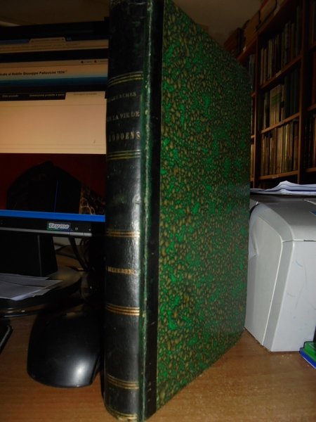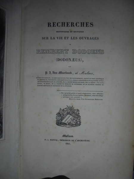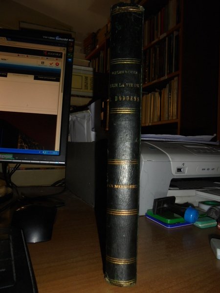 RECHERCHES historiques et critiques sur la vie et les ouvrages de Rembert Dodoens (Dodonaeus). Malines, P.J. Hanicq, 1841. In-8°, m. pelle coeva. xvi, 340 pp., ritratto e una tavola f.t. Il cap. VIII contiene la Bibliographie raisonnée des ouvrages de Dodoens (pp. 265-279) e la Liste bibliographique des lettres de Dodoens (pp. 280-282); il cap. IX contiene la Liste des ouvrages qui donnent des détaile sur la vie ou les oeuvres de Dodoens (pp. 283-292). Ottimo esemplare. Neg. esot. mob. 10