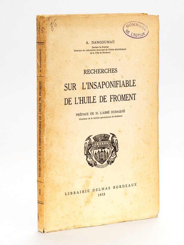 Préface de l'abbé Dubaquié, directeur de la station agronomique de Bordeaux, 1 vol. in-8 br., Librairie Delmas, Bordeaux, 1935, 146 pp. Travail peu courant consacré à l'étude de la valeur alimentaire du froment. Etat très satisfaisant (rouss. sur couv., cachet d'hommage de l'auteur, bon état par ailleurs)