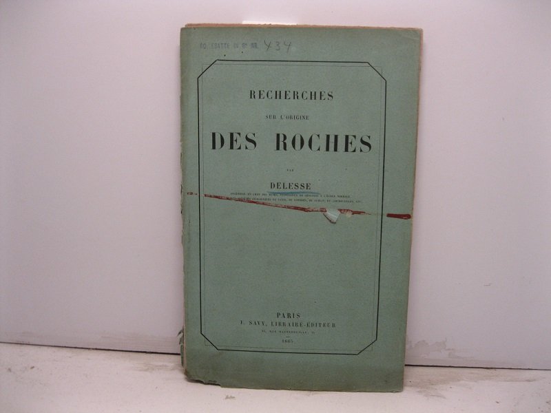 In 8, pp. 74 + (2b). Intonso. D. rifatto. Carta legg. brunita. Br. ed. Importante studio sull'origine delle rocce di questo geologo francese (1817-1881) che si dedico' in particolare alla litologia divenendo presidente della Societa' Geologica francese.