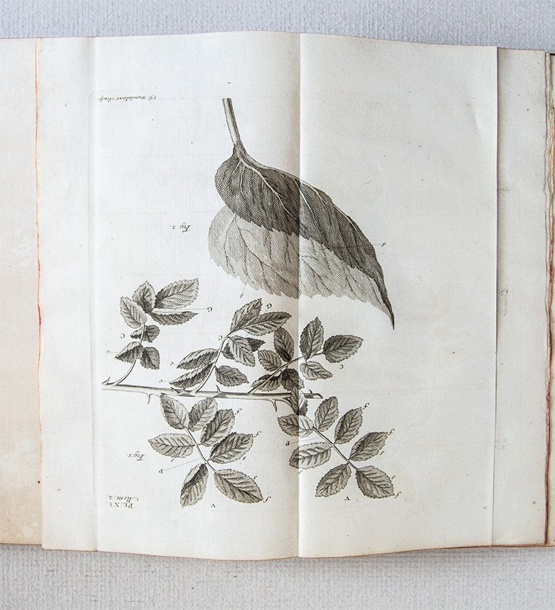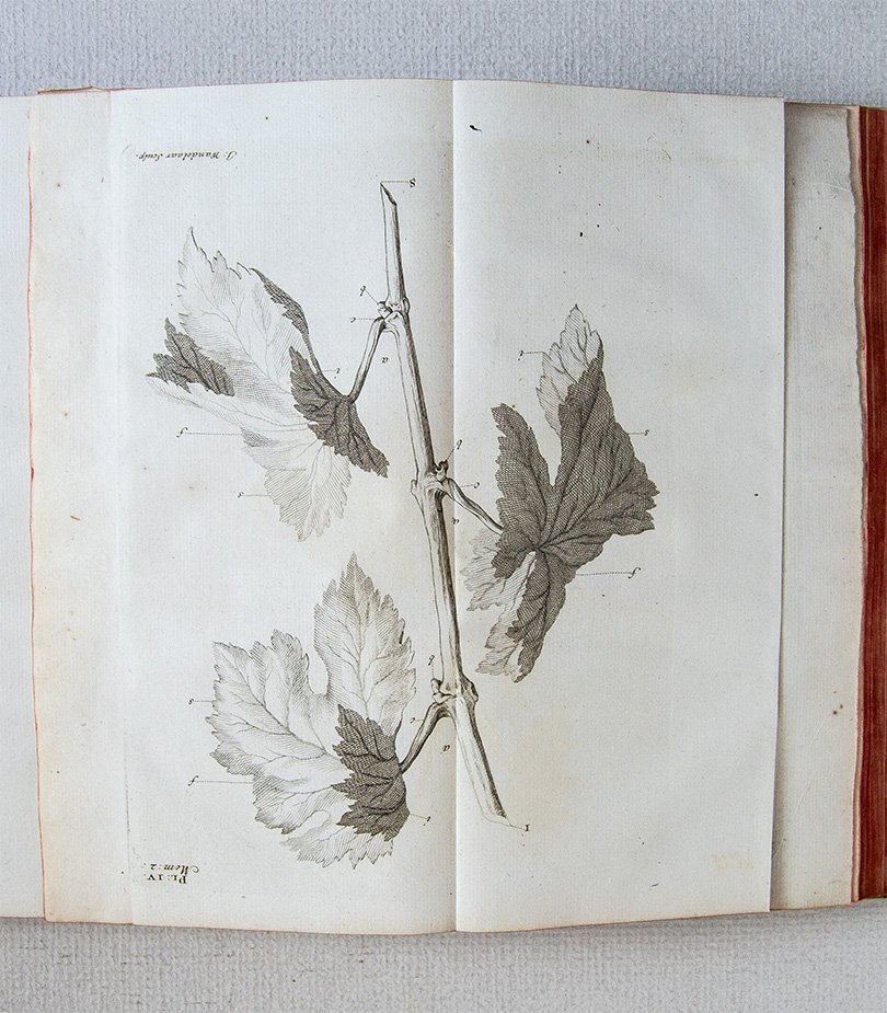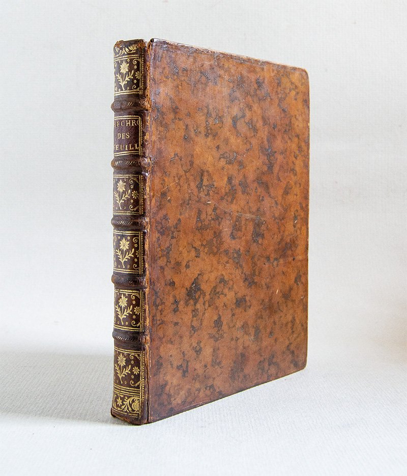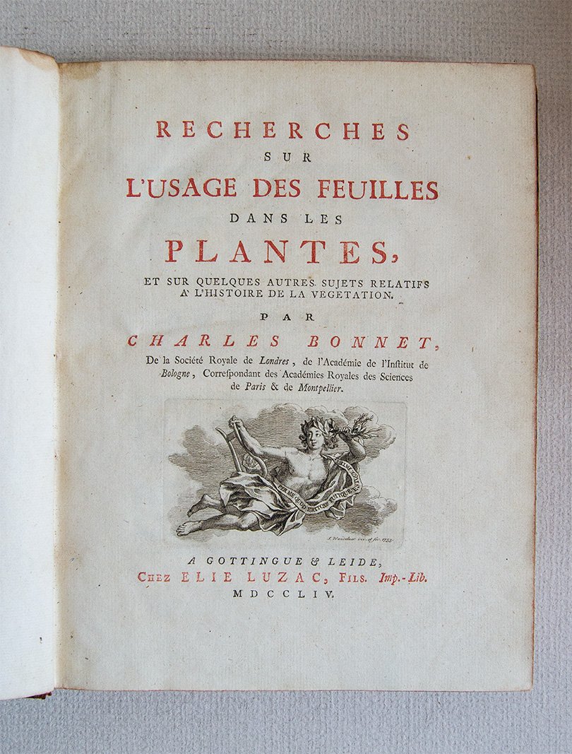 PRIMA EDIZIONE. Piena pelle coeva con fregi e titolo in oro sul dorso. Piccola mancanza in fondo al dorso, angoli un po’ consumati, leggere bruniture principalmente sulle tavole per il resto in ottimo stato. Ex libris Arpad Plesch. vii, (1), 343, (1) pp. con 31 tavv. rip. Bonnet (1720-1793) descrive accuratamente le caratteristiche del nutrimento delle foglie e i fenomeni della loro respirazione. Per la sua magistrale sperimentazione Bonnet viene considerato come il prima naturalista a investigare il fenomeno della fotosintesi.
