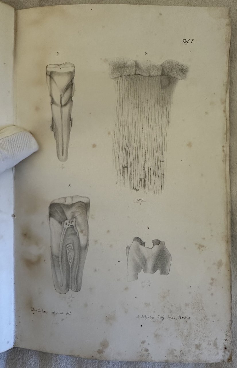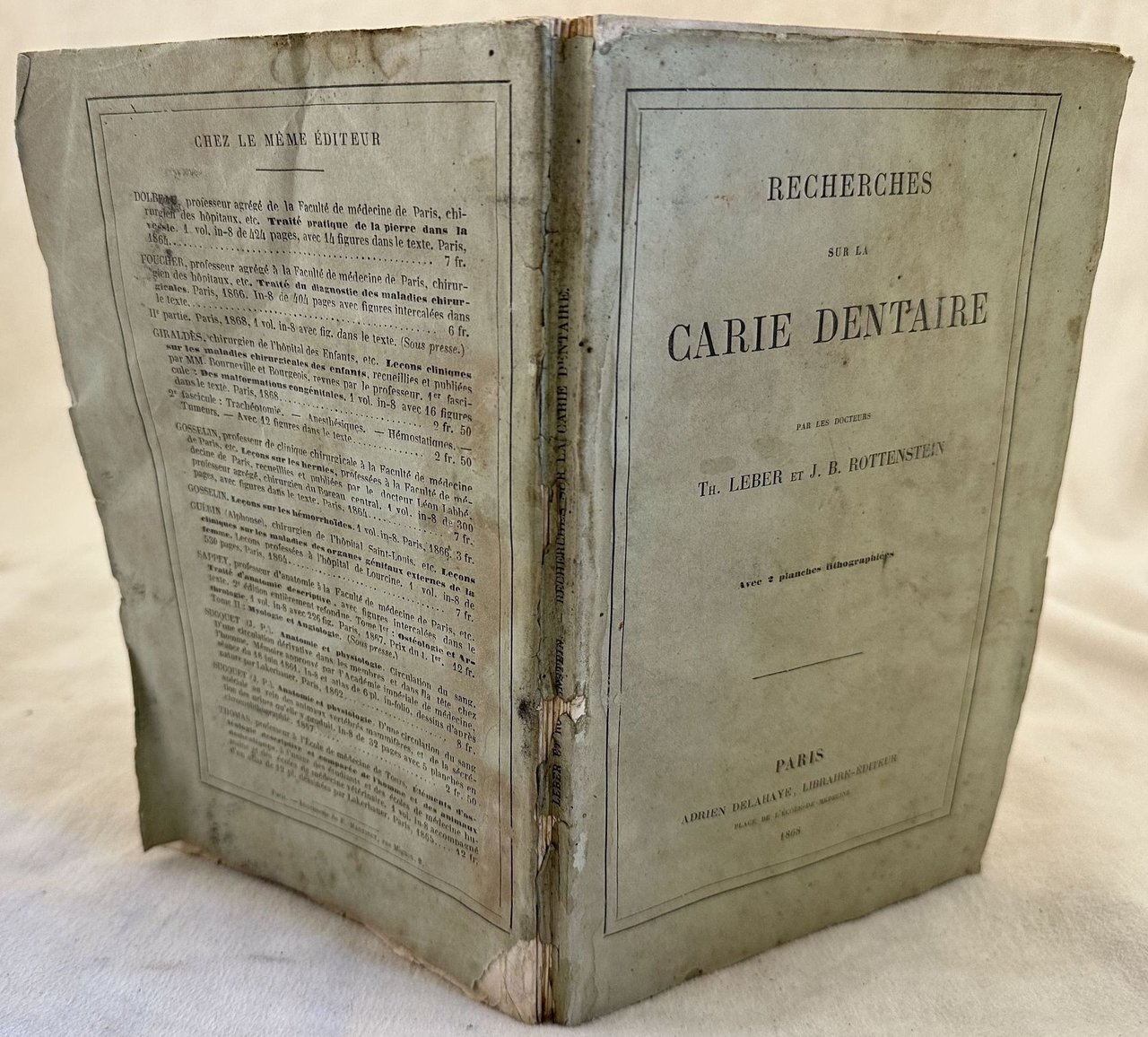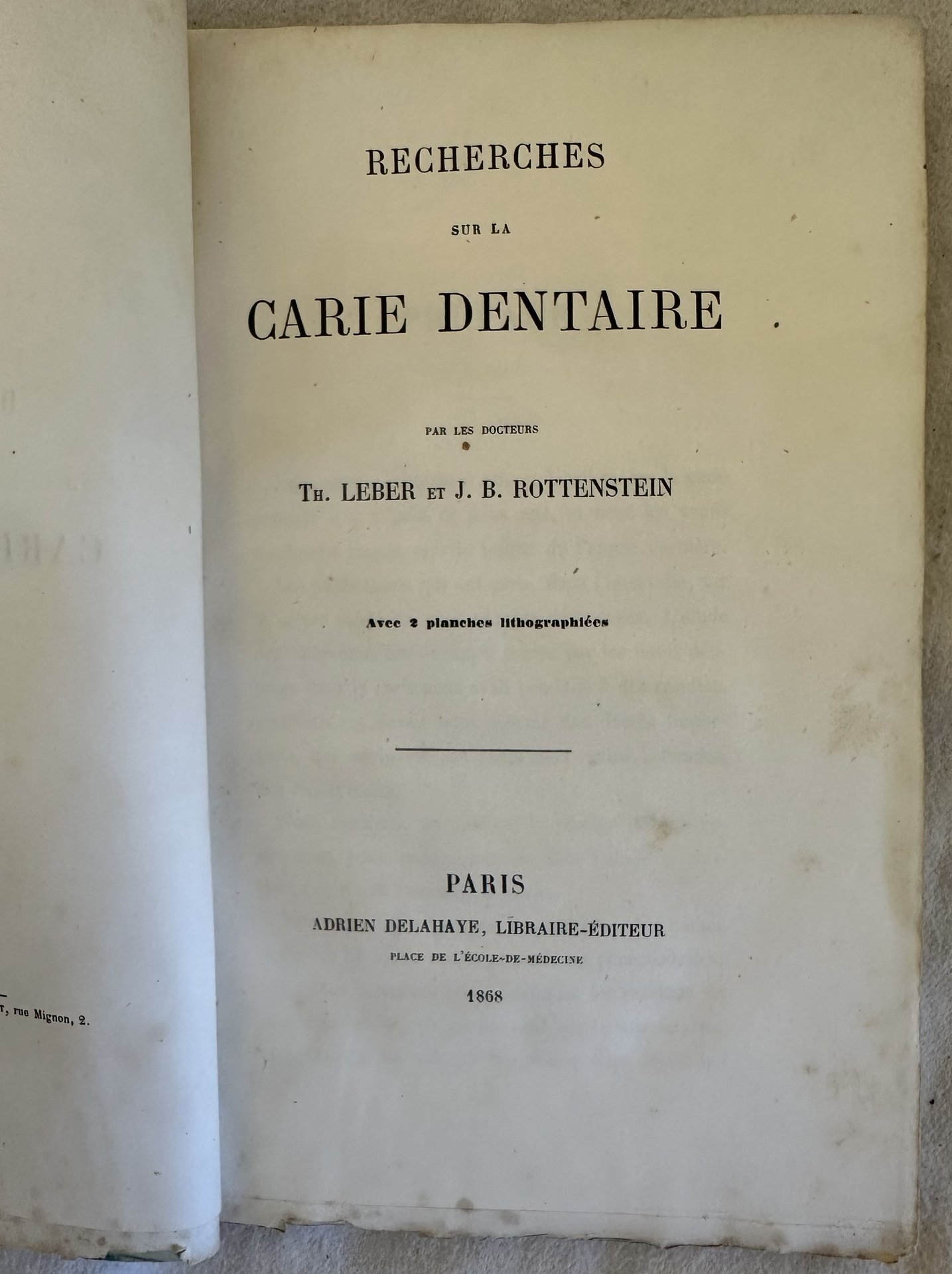 Edizione del 1868 di questa monografia sulla carie dentale scritto da Leber e Rottenstein.<BR><BR>Alla fine sono presenti due tavole litografate.<BR><BR>All'interno sintomi, cause e vari tipi di carie. <BR><BR>In discrete condizioni.<BR><BR>Copertina editoriale in mediocri condizioni con usure ai margini e dorso. Legatura in discrete condizioni. Pagine in discrete condizioni con fioriture e gore. In 8. cm 22,5x14 cm. Pp. VI+130+(1)+II. <BR><BR>
