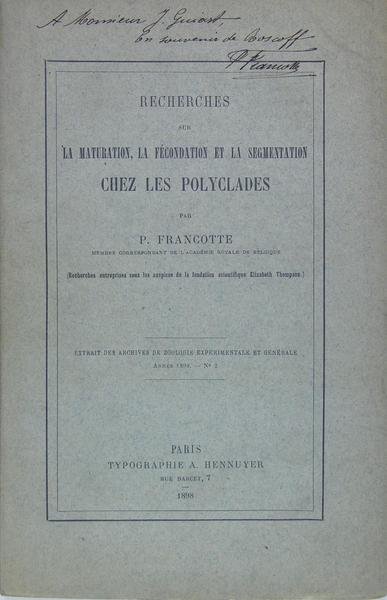 Paris, typographie Hennuyer, 1898. plaquette grand in/8 broché, couverture imprimée, p. 189 à 298, 7 planches in-fine. Envoi de l’auteur en couverture. Exemplaire en parfait état. Extrait des archives de zoologie expérimentale et générale année 1898 N°2.