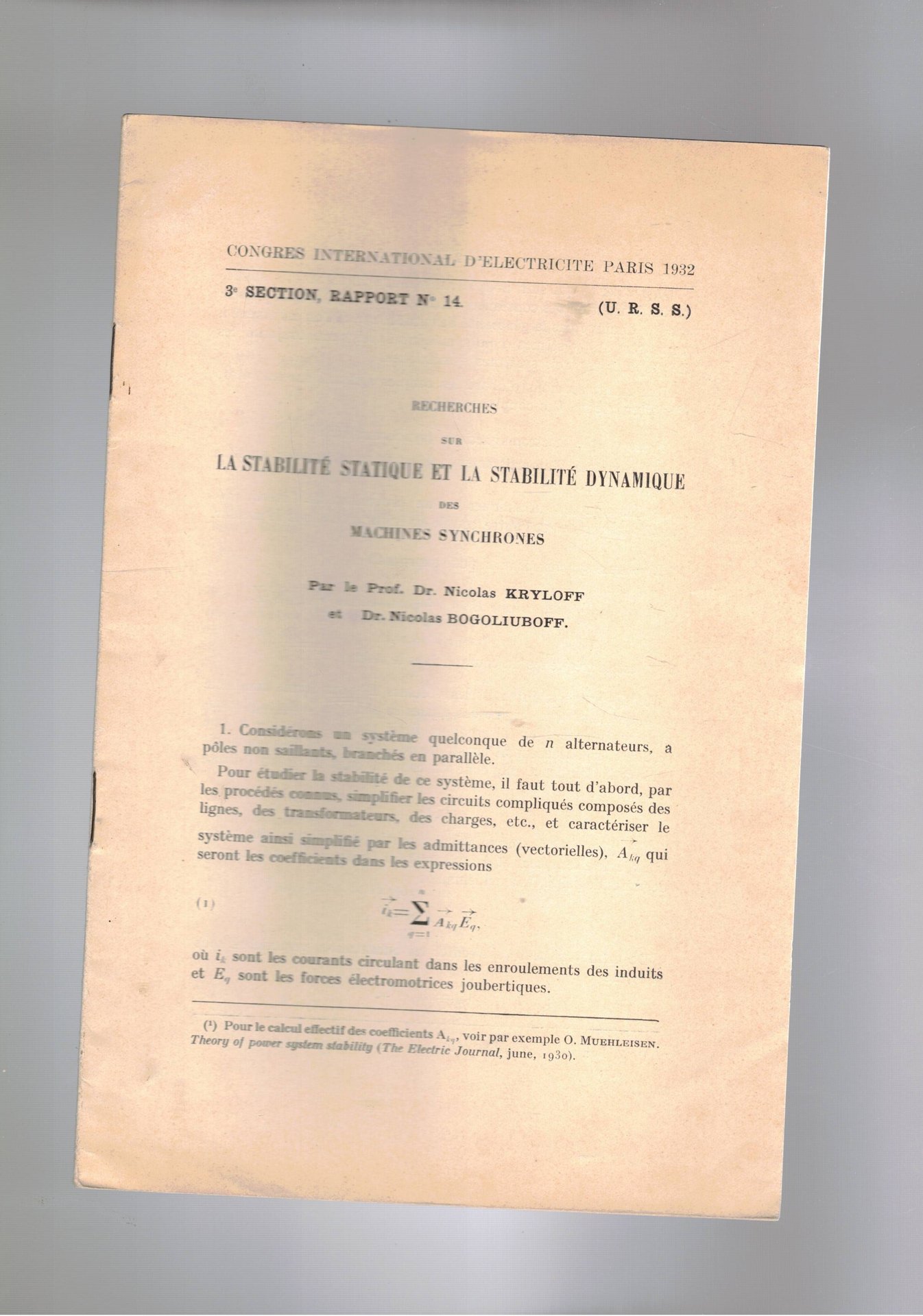 Recherches sur la stabilitè stattique et la stabilité dinamique des nachines syncrones. Rapprt n° 14 al Congres International d'electricitè di Parigi.
