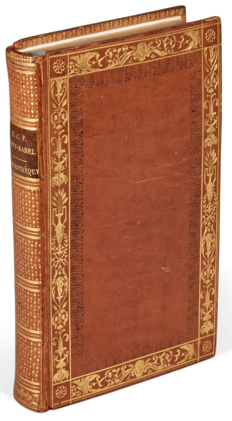 Large 8vo (198 x 118 mm). [4], vii, [1 blank], 448 pp., [1] leaf of explanatory text for folding plates, [4] pp. of advertisements at end, and 3 engraved plates (2 folding). With an extensive index. Contemporary light brown calf, by Antoine Chaumont, Paris (with his ticket), gold-tooled outer border with eagles, Pan's head, vase containing flowers and other ornaments, inner border in blind of laurel leaves in arches, flat spine with seven false bands and black morocco title label, gilt edges, blue endpapers, inner dentelles (joints starting). A fine and beautifully bound copy.