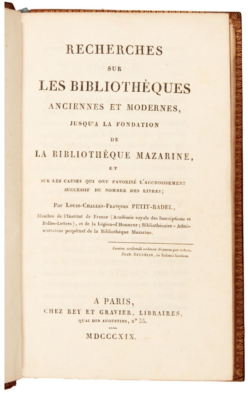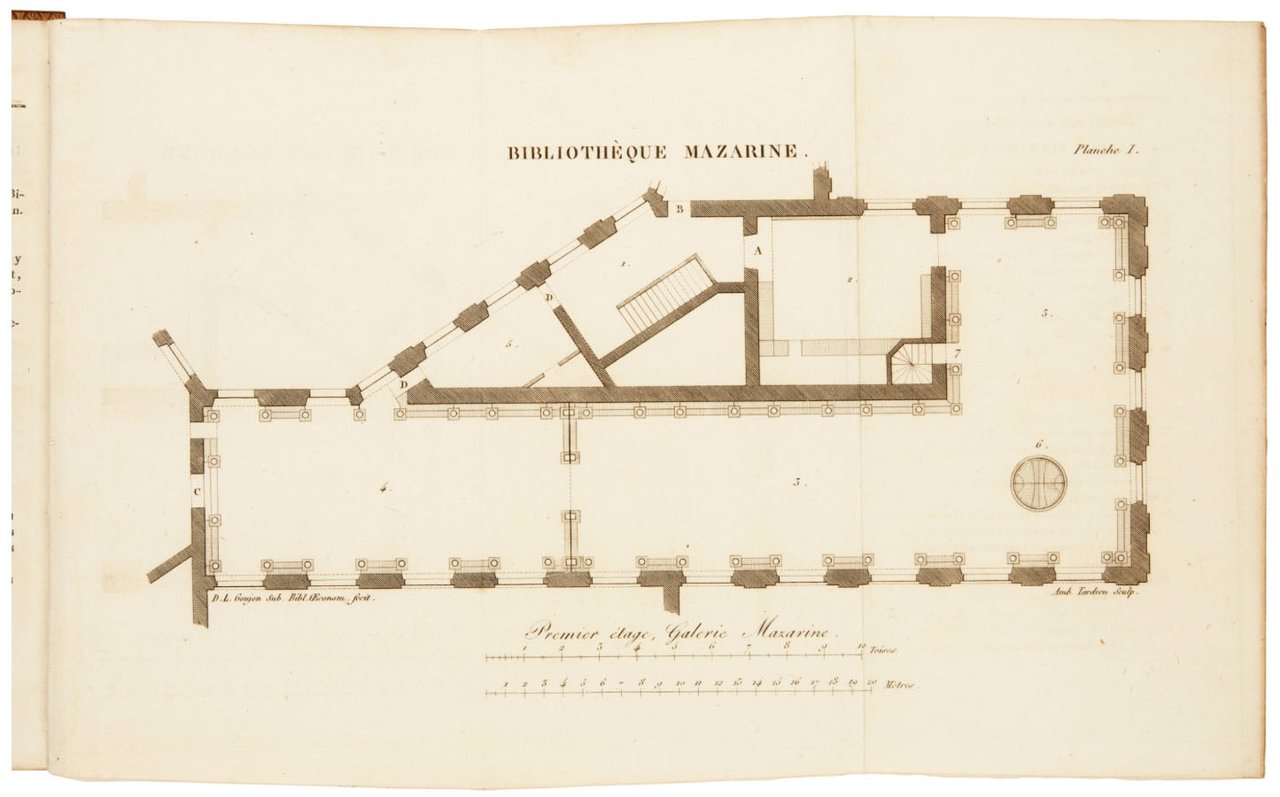 First edition of this valuable history of libraries, which offers an overview of the public libraries, especially in France, including those in provincial cities, from the 6th century onwards. A long section is devoted to the foundation and holdings of Bibliothèque Mazarine (Notice historique sur la Bibliothèque Mazarine, pp. [249]-337). The two folding plates depicts the floor plans of that institution. Petit-Radel (1756-1836) was librarian at the Mazarine from 1814 to 1836.