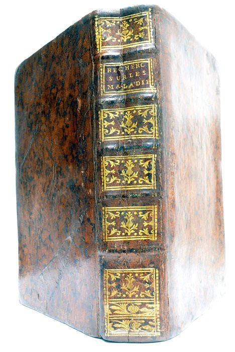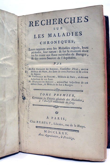 592 pages. (20x13 Cm). Plein veau de l'époque restauré. Dos à nerfs orné. Charnières un peu frottées. Edition rare de l'ouvrage le plus important de Bordeu dans lequel il expose pour le première fois la notion physiologique de "sécretion interne" dont on sait l'importance qu'elle a prise au XXs. sous le nom d'Endocrinologie. Cette notion suppose que les organes déversent dans le sang, de façon active, des produits qui influencent d'autres parties du corps Une grande partie de l'ouvrage est consacré aux eaux minérales, qui furent l'un des sujets de recherches de Bordeu, déjà commencées par son père, et qui font de lui un pionnier de l'hydrologie. Mais il existe aussi et surtout d'importantes digressions physiologiques et pathologiques. Bordeu considère la vie comme la somme de la vie de chacun des organes. Quelques annotations anciennes sur le titre. Rares taches et rousseurs. Quelques cahiers déboîtés.