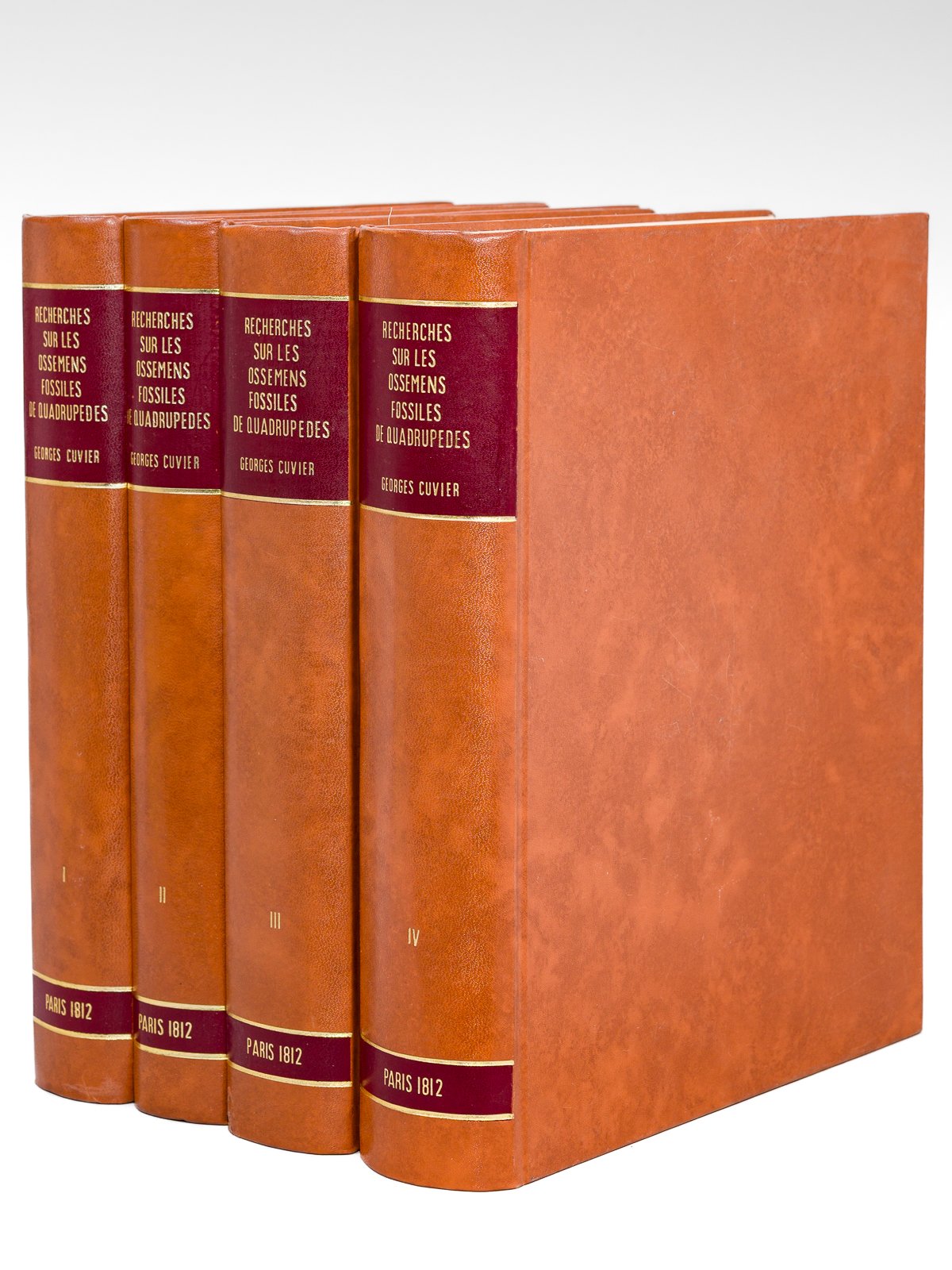 Impression anastaltique, Culture et Civilisations, Bruxelles, 1969, [ Chez Déterville, Paris, 1812 ], rappel du titre complet : Recherches sur les Ossemens Fossiles de Quadrupèdes, où l'on rétablit les Caractères de plusieurs Animaux que les Révolutions du Globe paroissent avoir détruites (4 Tomes - Complet) Tome I : Contenant le Discours préliminaire et la géographie minéralogique des environs de Paris ; Tome II : Contenant les Pachydermes des couches meubles et des terrains d'alluvion ; Tome III : Contenant les os fossiles des environs de Paris ; Tome IV : Contenant les Ruminans, les Onguiculés et les Reptiles Fossiles Beau fac-similé de l'oeuvre fondamentale de Georges Cuvier. C'est l'introduction de cet ouvrage qui fut publiée à part sous le titre : "Discours sur les révolutions de la surface du Globe". Cette belle réimpression reproduit notamment la grande "Carte géognostique des environs de Paris", en couleurs. Bon état (frott. au dos en queue du tome III, rares petits frott., bon exemplaire en très bon état par ailleurs).