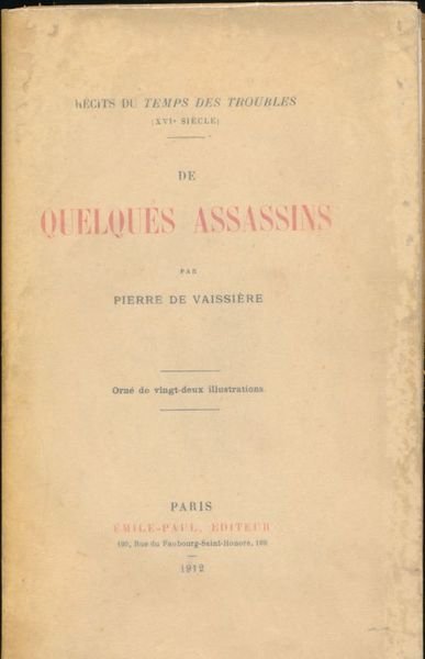 Emile Paul 1912 Paris, Emile Paul éditeur 1912. Fort in-8 broché, couverture à rabats de 405 pages + tables. Frontispice et 22 illustrations hors texte. Jean Poltrot, Seigneur de Méré. Charles de Louviers, Seigneur de Maurevert. Jean Yanowitz, dit Besme. Henry III et les "quarante cinq". Jacques Clément. Quelques rousseurs éparses, bords de couverture un peu abimés néanmoins très bon exemplaire