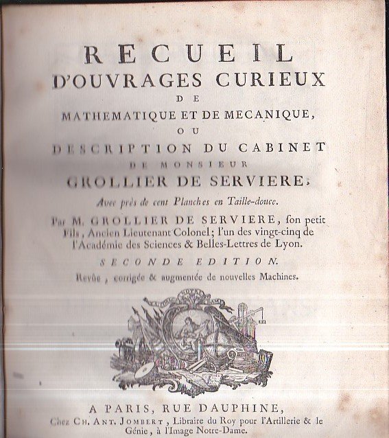 Recueil d' ouvrages curieux de mathematique et de mecanique, ou description du cabinet de Monsieur Grollier de Serviere, avec près de cent Planches en taille - douce