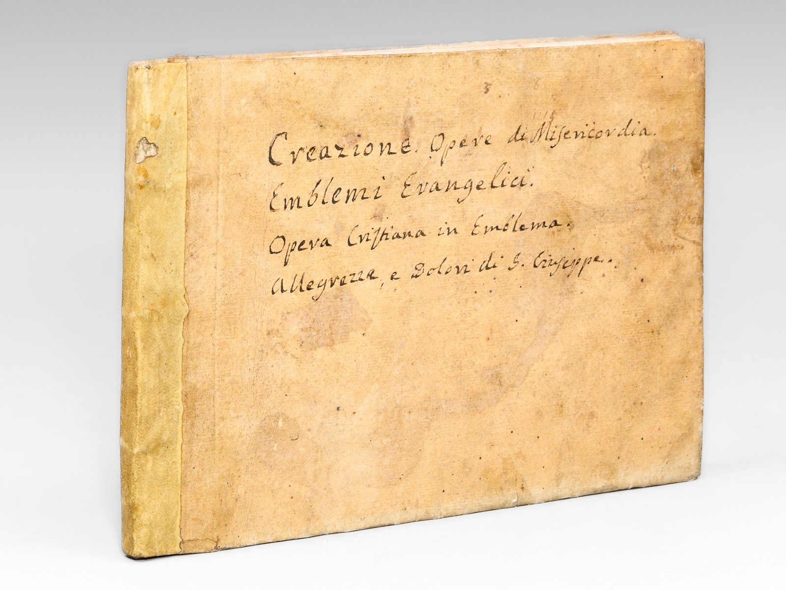 1 vol. in-8 format à l'italienne (25,5 x 17,7 cm) reliure demi-vélin blanc, cartonnage ancien en plat avec titre manuscrit, s.l.n.d. [ Venezia , circa 1610-1640 ]. Contient : [ Creazione ], 5 gravures numérotées de 3 à 7, format 17 x 12,2 cm [Suivi de : ] [ Opere de Misericordia ] 7 gravures numérotées de I à IIIIIII, format 16,2 x 12,2 cm [Suivi de : ] Emblemata Evangelica ad XII signa coelestia sive totidem anni menses accommodata, Quibus Christus homines, qui Astris ad distinguenda tantum tempora initio a Deo (ut est Gen. I) conditis, idolatricum cultum prestiterant per has ipsas creaturas ad unius omnium Creatoris cultum revocat, et regnum celeste mystice of oculis ponit ; 13 gravures, format 19,2 x 11 cm [ Suivi de : ] [Il Prodigo Figlio ] 4 gravures numérotées de 1 à 4, format 19,8 x 13,2 cm [Suivi de : ] [ Histoire de Joseph ], 6 gravures numérotées de I à VI, format 17 x 12,2 cm [ Suivi de : ] [Opera Cristiana in Emblema ] 4 gravures format 17 x 12 cm [ Suivi de : ] Brevi meditationi de' sette dolori et allegreze di San Giosefo. Al Molto Illre [. ] Sigre Ricciardo Mazzi Gigli Senatore Imolese, 8 gravures format 15,2 x 11 cm. Rassemblant 7 séries de gravures différentes, le présent recueil devait contenir à l'origine 49 ou 50 planches, les 2 premières ont été supprimées, probablement suite à un dégât par le feu, visible en angle en marge intérieure dans la première moitié de l'ouvrage. Les angles des 8 premières gravures ont été coupés et restaurés (les coupures n'affectant que marginalement les impressions). Le recueil avait été numéroté à la main, et l'absence d'une gravure numérotée 9 correspond soit à une probable erreur initiale de numérotation, soit à un manque dans la seconde série ("Misericordia"). On connaît peu de choses sur la vie du graveur Gaspare Grispoldi, dont on sait qu'il fut notamment actif à Venise de 1610 à 1625. Nous n'avons pu découvrir aucune trace d'un recueil comparable par son importance et sa diversité.