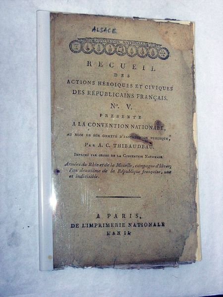 Recueil des actions héroïques et civiques des républicains français. NºV. Présenté à la Convention nationale au nom de son comité d'instruction publique, armées du Rhin et de la Moselle, campagne d'hiver; l'an deuxième de la République française, une et indivisible.