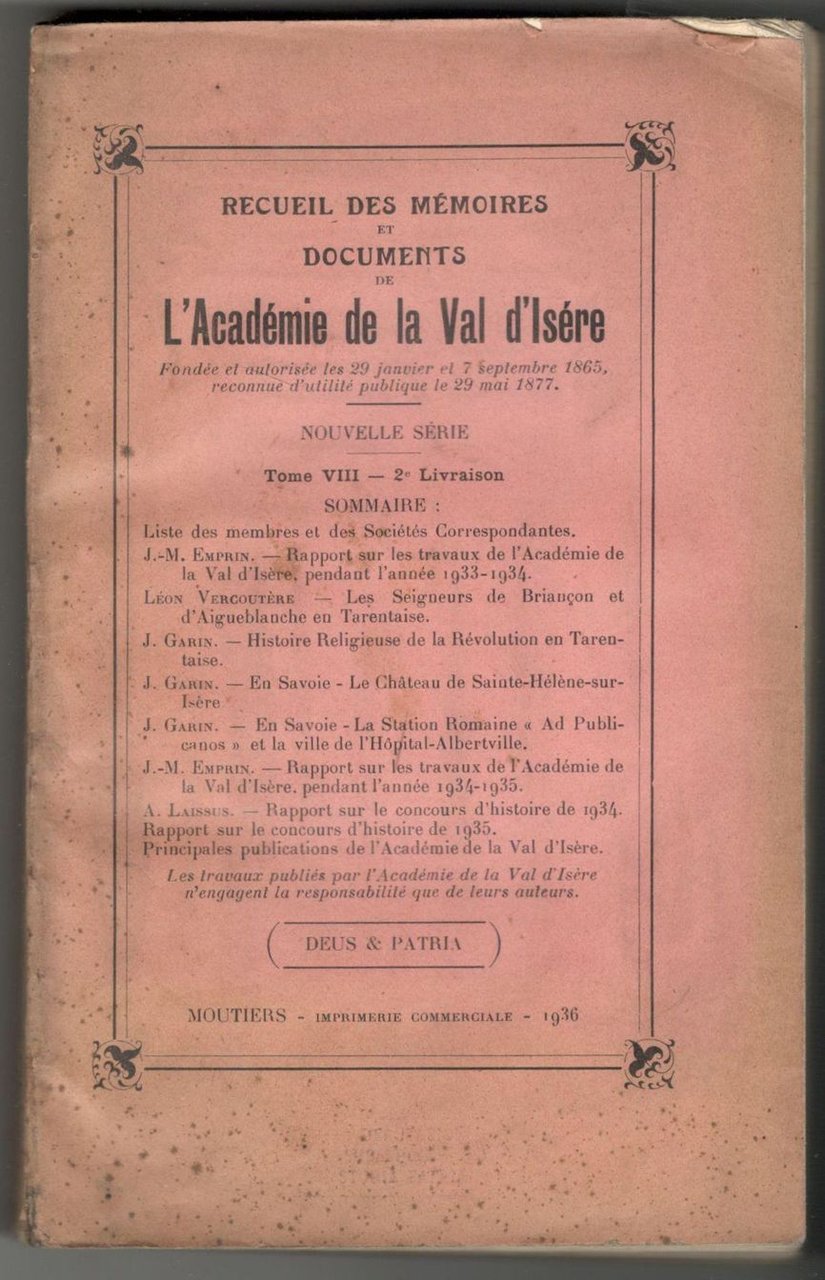 Recueil des mémoires et Documents de l'Académie de la Val d'Isère. Nouvelle série. Tome VIII - 2e livraison