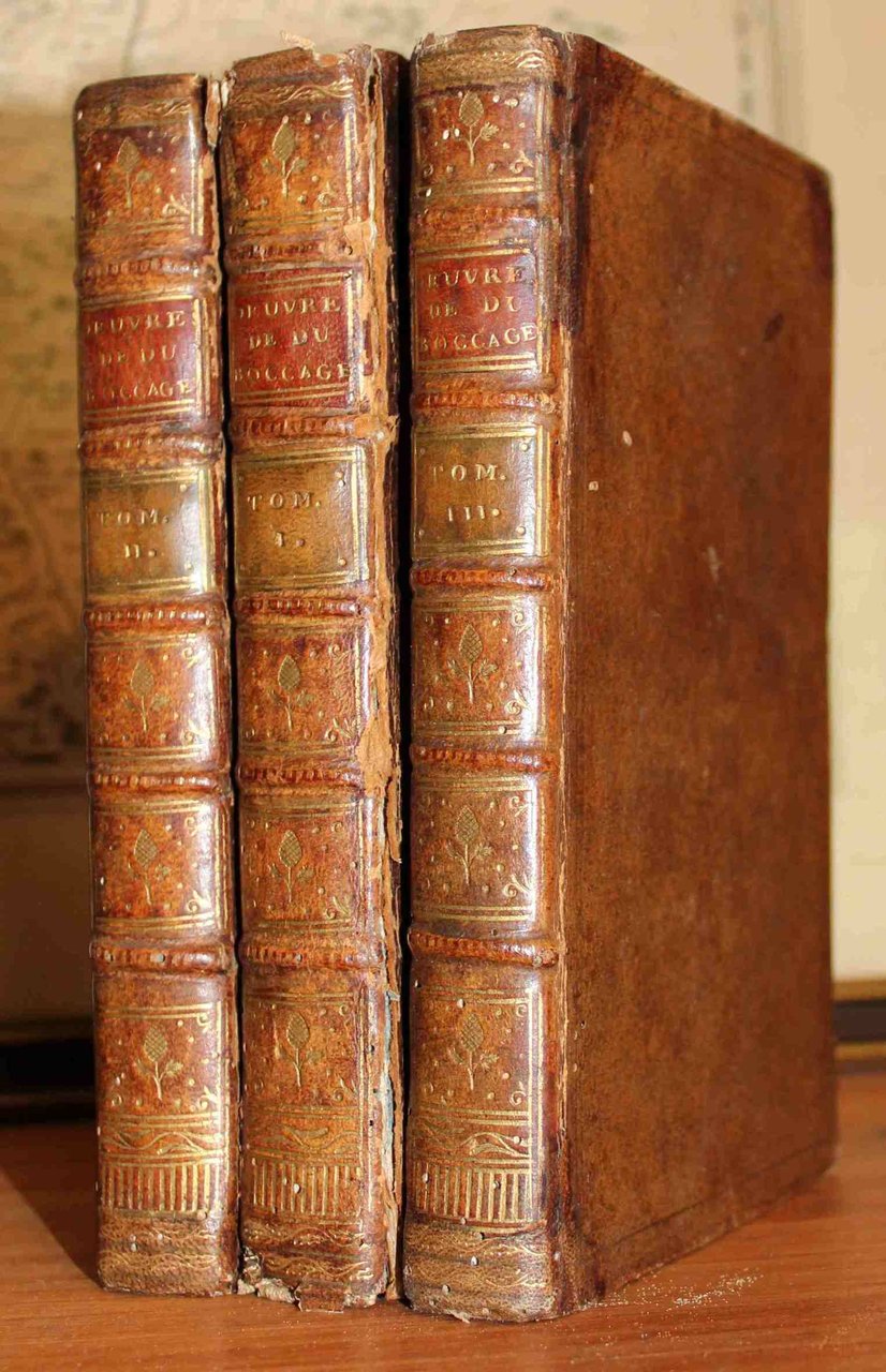 3 voll. in 12°, pp. (4), 336; (4), 351, (1); (4), 396, (4), legatura tutta pelle coeva, titolo, numerazione e fregi oro sui dorsi. Tagli marmorizzati. Cuffie consumate e la cerniera del primo volume rotta. Nel primo volume antiporta con ritratto dell'autrice inciso in rame da Tardieu su disegno di M.lle Loir, frontespizio con vignetta allegorica incisa in rame da Baquoy, con 1 tavola raffig. Adamo ed Eva del Tardieu e una graziosa testatina (a p. 11) ill. la scacciata dal Paradiso Terrestre; nel secondo e terzo volume frontespizio con bella vignetta incisa sempre dal Tardieu su disegno di Cochin; in tutti deliziose testatine e finalini. L'edizione comprende il celebre poema epico 'La Colombiade'. Seconda edizione (la prima è del 1762) che raccoglie tutte le opere scritte dall'A. (1710-1802) celebre al tempo soprattutto per il suo circolo culturale frequentato da uominidi cultura quali Fontenelle, Marmontel, Condillac, Condorcet, Algarotti.