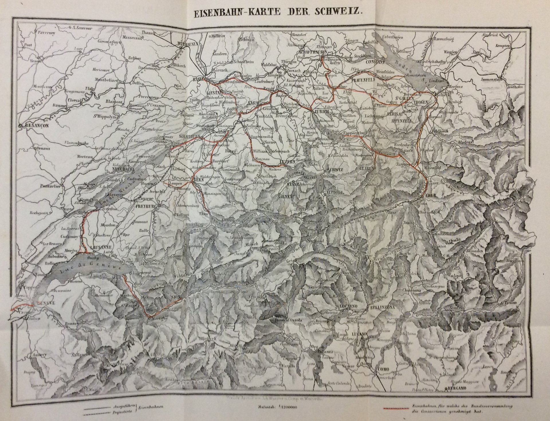In-8 p. (mm. 210x140), brossura editoriale (picc. manc. al dorso), pp. VII,359, con 1 Eisenbahn-Karte der Schweiz, più volte ripiegata, alla fine del volume. Contiene: Loi fédérale sur l'expropriation pour cause d'utilié publique, du 1er Mai 1850 - Lignes du Lac de Constance, du Rheinthal, du Lac de Wallenstadt, lignes centrales, Sud-Est, Zurich.. Testo ben conservato.