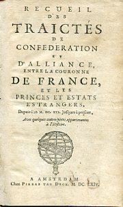 In-12° (161x98mm), pp. (16), 512, legatura coeva p. pelle con dorso a nervetti adorno di titolo in oro su tassello granata e fregi ornamentali in oro entro scomparti. Unghie decorate in oro, tagli colorati a spruzzo. Sfera armillare elzeviriana incisa su legno al titolo. Fregi tipografici incisi in xilografia. Buon esemplare. Raccolta in edizione similelzeviriana (pubblicata a Bruxelles con falso luogo di Amsterdam e con fittizie indicazioni tipografiche, in quanto in realtà essa venne impressa dal Foppenes e non nel 1664, bensì tre anni dopo) dei trattati di alleanza stipulati fra la Francia e le principali nazioni europee amiche della corona francese dal 1621 sino alla data di pubblicazione del volume. HPB, FRBC016511480-E. Cfr. Willems, 2076 (ristampa con data del 1672 identica a questa): 'Jolie édition, imprimée par Fr. Foppens'.