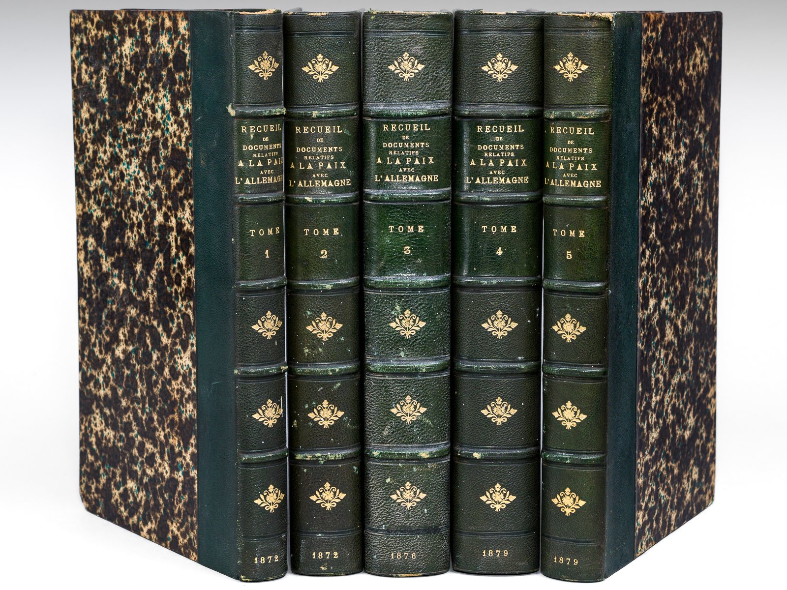 5 vol. in-4 reliure de l'époque demi-chagrin vert, dos à 5 nerfs orné, tranches sup. peignées, Imprimerie Nationale, Paris, Juin 1872, Août 1872, Juillet 1876, Mars 1879, Mars 1879. Rappel du titre complet : Recueil des Traités, Conventions, Lois, Décrets et autres actes relatifs à la Paix avec l'Allemagne (5 Tomes - Complet) [ Edition originale ] Tome I : Conventions diplomatiques et Militaires. Actes législatifs. Janvier 1871 à Juin 1872 ; Tome II : Documents complémentaires. Débats législatifs, Exposé des motifs, Rapports, Instructions, Notes, Pièces diverses. Février 1871 à Août 1872 ; Tome III : Documents complémentaires concernant les Lois d'indemnité. Mars 1871 à Juin 1876 ; Tome IV : Acquittement de l'indemnité de guerre et Evacuation du Territoire. Délimitation des Frontières. Réorganisation des territoires morcelés. Reconstitution des Actes de l'Etat civil, des Voies de communication, de la Défense Nationale, des Edifices Publics détruits, Sépulture des Soldats, Liquidation des Territoires cédés, Compte de liquidation de diverses charges résultant de la guerre ; Tome V : Addenda - Tables précédés d'un avertissement de l'éditeur Rare exemplaire parfaitement complet de ce recueil de référence sur les conséquences diplomatiques, militaires et financières de la Guerre de 1870. Bon état (dos un peu frottés, petit accroc sur une coiffe, bon exemplaire par ailleurs).