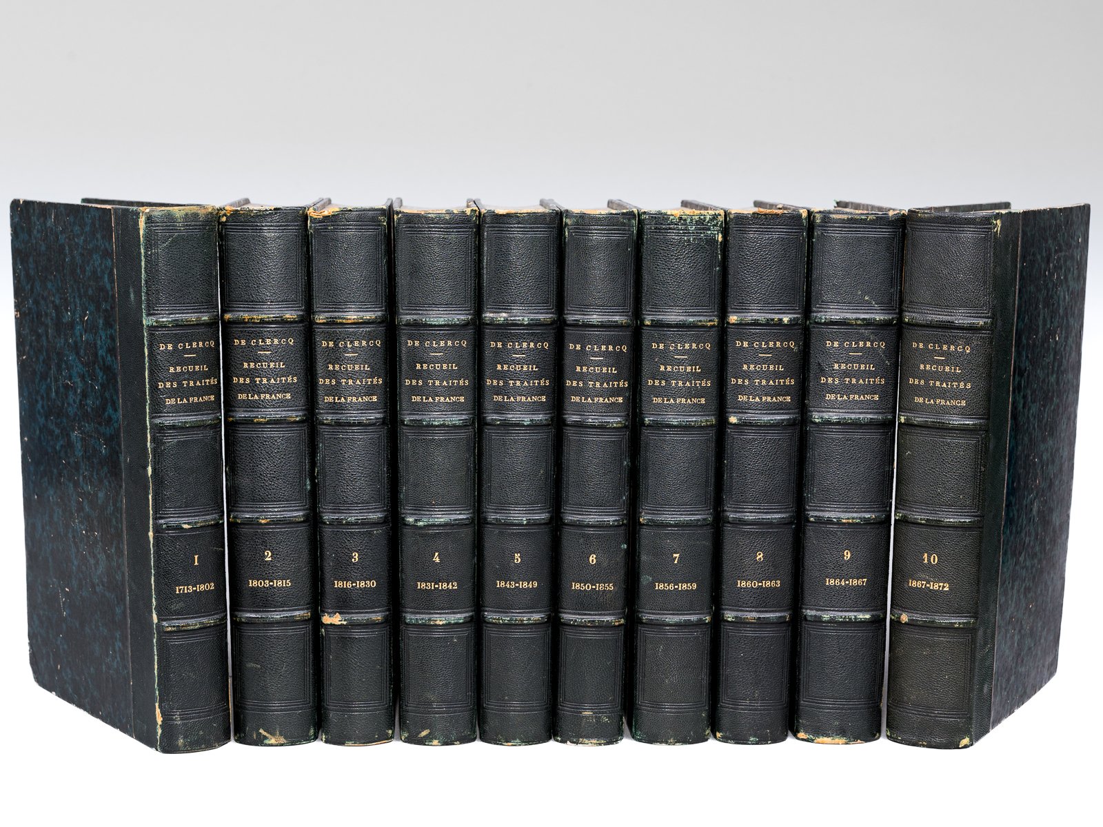 Publié sous les auspices de son Excellence M. Drouyn de Lhuys, 10 vol. grand in-8 reliure demi-chagrin noir, Amyot, éditeur des Archives Diplomatiques, 1864-1877 : Recueil des Traités de la France (Tomes 1 à 10) Tome I : 1713-1802 ; Tome II : 1803-1815 ; Tome III : 1816-1830 ; Tome IV : 1831-1842 ; Tome V : 1843-1849 ; Tome VI : 1850-1855 ; Tome VII : 1856-1859 ; Tome VIII : 1860-1863 ; Tome IX : 1866-1867 ; Tome X : 1867-1872 Rare série suivie couvrant l'intégralité de la période de la mort de Louis XIV à la chute du Second Empire. Bon ensemble (reliure lég. frottée, petit mq. à une coiffe, bon exemplaire par ailleurs).