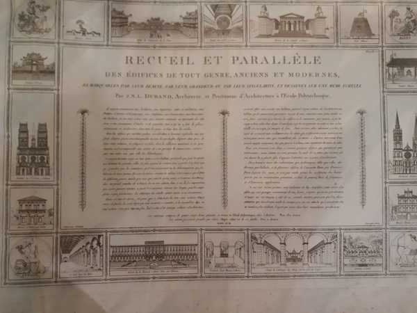 In folio massimo oblungo, collezione di 90 incisioni f.t. eseguite in delineato. Legatura modena in mz tela con la brossura originale applicata al piatto anteriore. Unica edizione di questo volume apparso a dispense. Esemplare con qualche macchia che interessa alcune tavole.Pierre-Nicolas-Louis Durand (1760-1834) insegna architettura all' 'Ecole polytechnique e la sua influenza fu decisiva per la diffusione dell'accademismo basato sulle fonti antiche.