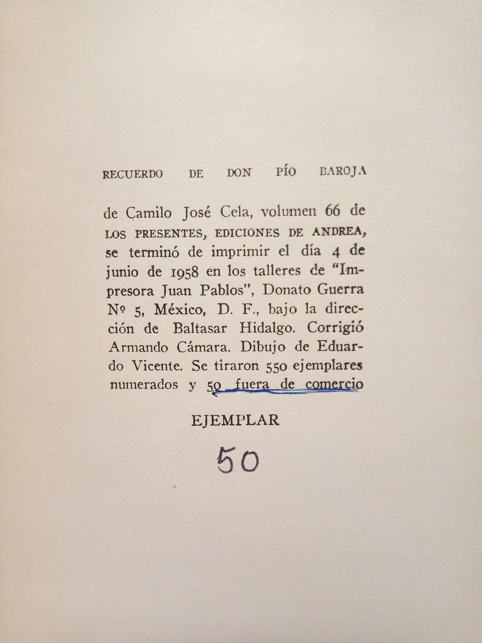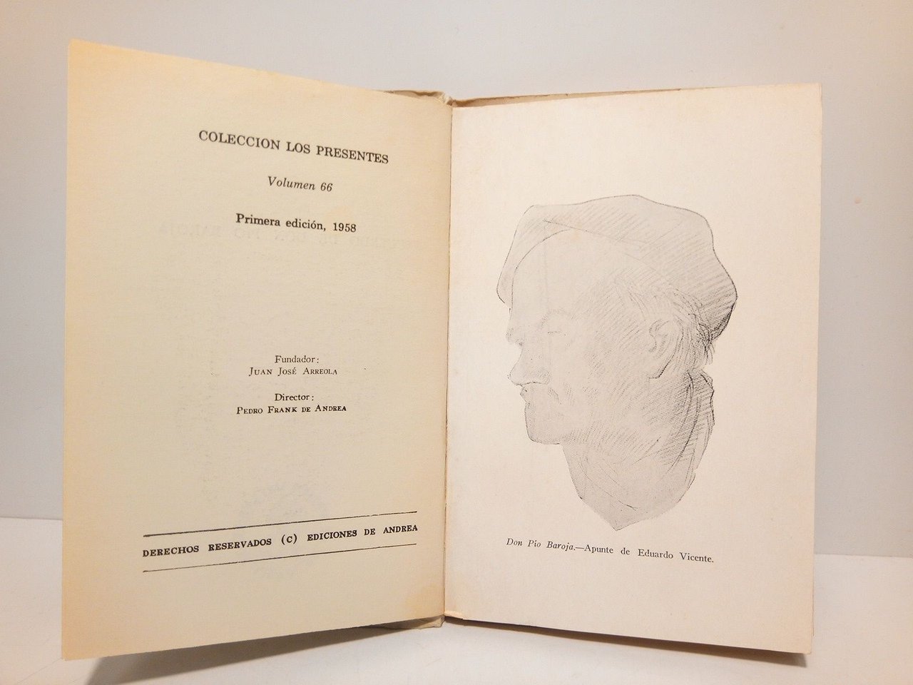 PRIMERA EDICION.- México: Eds. de Andrea, 1958.- 77 p., [1 h.]: Retrato de Pio Baroja ante la portada; 8º (18,5 x 12,5 cm); Buena impresión sobre papel de alta calidad; Intonso; Cartulina Ed. conolección solapas.- (Colección Los Presentes. Vol. 66).- Edición de 550 ejemplares numerados ny 50 fuera de comercio).- RARO.* Excelente estado. Tan solo en la portadilla tiene estampado un sello del antiguo propietario. Dudamos si este ejemplar pertenece al grupo de los 50 no venales, ya que en el colofón va numerado a mano con el Nº 50 y va subrayado el párrafo donde indica esto. Creemos que los otros iban numerados con técnicas de impresión mecánica, aunque no podemos asegurarlo con absoluta seguridad. LITERATURA Y FILOSOFÍA ESPAÑOLAS DE LOS SIGLOS XIX-XXI Y SU HISTORIA EN GENERAL