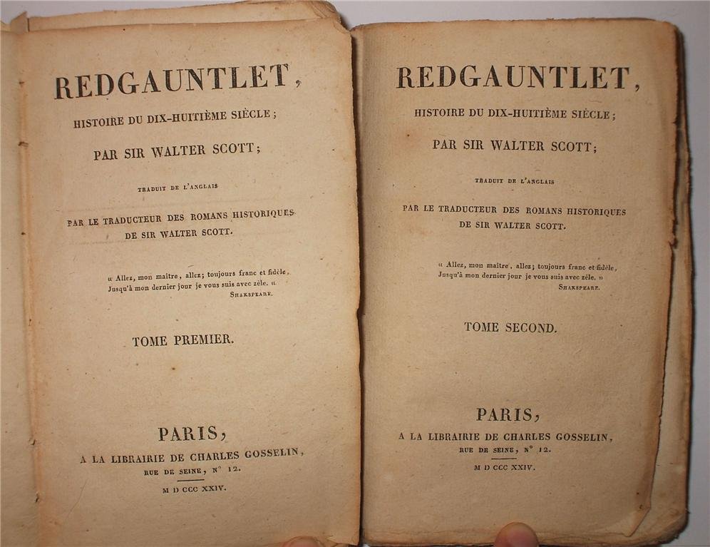 In 8 Dim. 17,5x11 cm. Pp. 296+240. Primi due volumi di quattro. Prima edizione francese. Ultimo romanzo di Scott sulla questione giacobita. Copertina morbida in cattive condizioni. Legatura quasi assente. Pagine in ottime condizioni con fioriture. First two volumes of four. First french edition. Last novel by Scott about the jacobite cause. Soft cover in bad conditions. Binding almost absent. Pages in very good conditions with foxings.