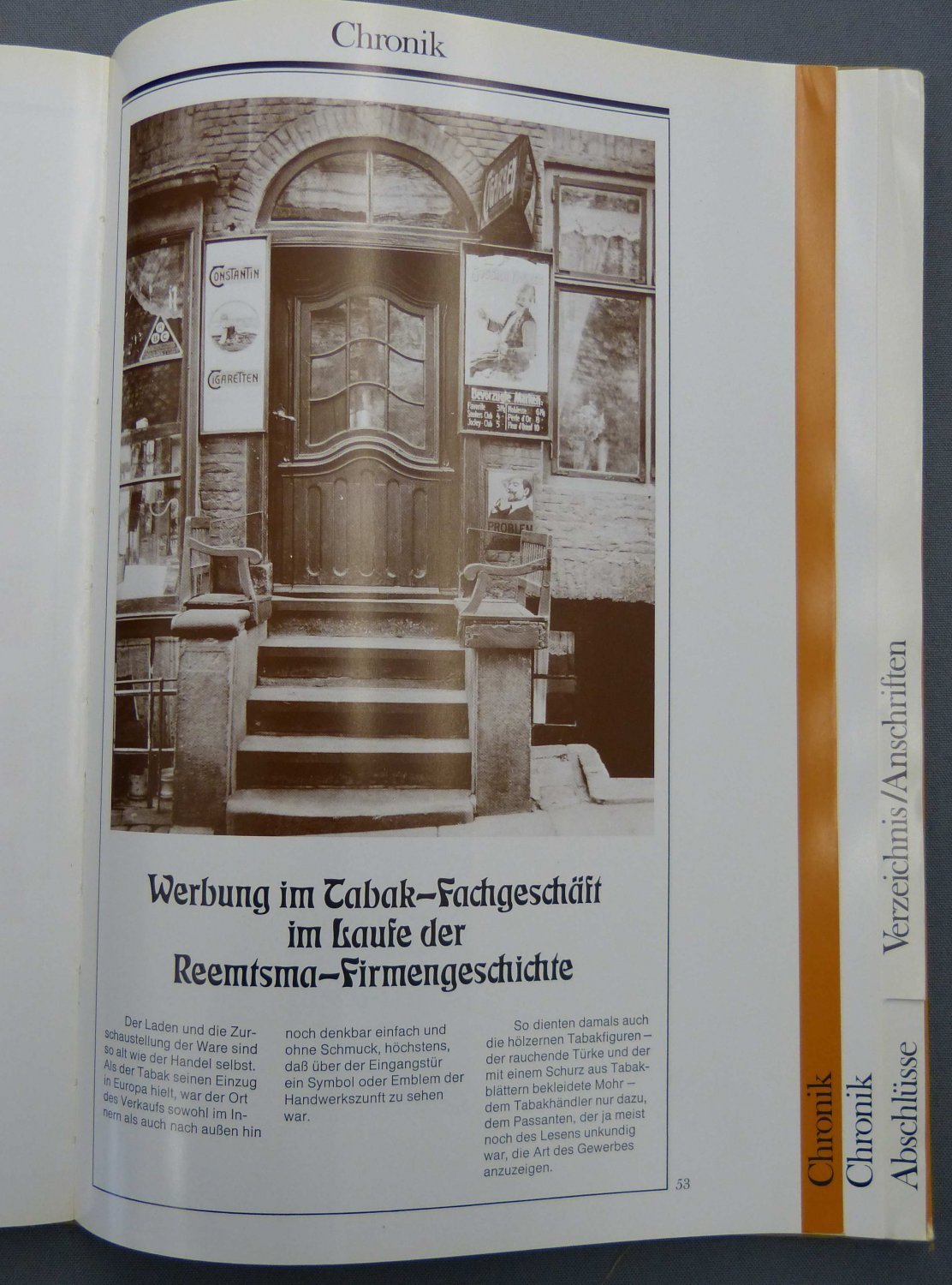 Mit vielen, teils farbigen Abbildungen, Übersicht der Zigaretten-Marken im In- und Ausland und der Getränkemarken des Unternehmens, einer Chronik der Werbung im Tabakgeschäft und einmontierter Mappe "Abschlüsse".