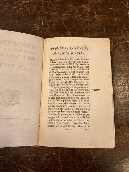 In-8° (178x119mm), pp.(2), 192, legatura ottocentesca m. pelle e angoli marrone con fregi in oro e titolo in oro entro tassello al dorso. Piatti marmorizzati. Vignetta incisa al frontespizio. Annotazioni di mano antica al verso della prima c. bianca. Qualche minima fioritura. Ottimo esemplare. Prima edizione, molto rara e pubblicata in veste anonima, di questa refutazione compiuta dal barnabita savoiardo delle dottrine pedagogiche e generalmente filosofiche di Rousseau. L'acume e la sottigliezza delle argomentazioni sfoggiate dal Gerdil valsero all'opera (edita in seguito con il nome di 'Anti-Emile') la considerazione dello stesso Rousseau, che dichiarò senza mezzi termini: 'Voilà l'unique écrit publié contre moi que j'ai trouvé digne d'être lu en entier'. Giacinto Sigismondo Gerdil (Samoens, Savoia, 1718-Roma, 1802), barnabita, professore di filosofia in varie università italiane, amico del cardinale Lambertini e di Benedetto XIV nonché precettore del futuro re Carlo Emanuele IV, fu creato cardinale da Pio VI. Il suo nome è legato soprattutto all'attività di pedagogista. In filosofia fu seguace, senza troppa originalità, di Locke e di Malebranche e rispecchiò in modo eloquente il disagio che incontrò lo spiritualismo dinanzi al razionalismo dell'Encyclopédie e dei Lumi, mentre il suo pensiero politico, eminentemente lockiano, fu pervaso da una costante polemica con Hobbes e con il contrattualismo di Rousseau, da lui reputato pericoloso sovvertitore dell'ordine sociale (lo stesso Rousseau, peraltro, apprezzò molte delle critiche del Gerdil, di cui riconobbe la finezza speculativa). Una raccolta delle sue 'Opere ed inedite' apparve a Roma tra il 1806 e il 1821 in 20 volumi. Conlon, Ouvrages Français relatifs à Jean-Jacques Rousseau 1751-1799. Bibliographie Chronologique, 242. Conlon, 63:868. Melzi, II, p. 416. Barbier, IV, 156.