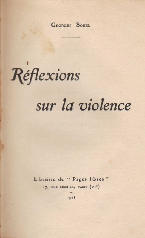 In-8° grande (cm 22 x 13,5), legatura novecentesca in mezza pelle con punte, con titolo e filetti in oro al dorso a quattro falsi nervi; pp. XLIII(1)-257(3). Ex-libris di accademico al contropiatto. Edizione originale dell'opera principale di Sorel, apparsa solo in rivista su 'Le Mouvement socialiste' durante l'anno precedente. Riflettendo sull’opera di Marx e dei suoi esegeti francesi, italiani e tedeschi, Sorel coglie nella scarsa attenzione, se non nella vera e propria svalutazione del fattore morale, uno degli elementi deboli nell’analisi del filosofo del “materialismo storico”. Al contrario egli non solo vede nell’etica una dimensione decisiva dell’esistenza, ma annette “grandissima importanza alle considerazioni morali”, viste non già come un recupero meccanicistico di esperienze appartenute al passato, ma in quanto proiezione presente e futura di una società costruita grazie ad un proletariato libero non solo economicamente, ma anche eticamente, dagli egoismi liberal-borghesi. Non comune. Ottimo esemplare.