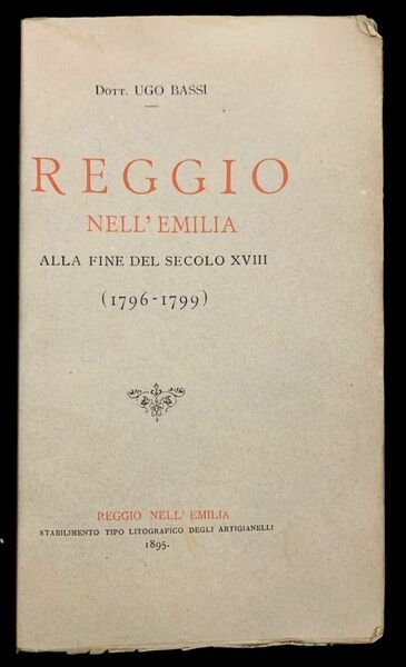In 8° (20x13 cm); IX, (1), 531, (1 b. ) pp. Brossura editoriale con un rinforzo antico al dorso. Qualche lieve difetto ai piatti. All'interno in buone-ottime condizioni di conservazione. Titolo in rosso e nero al piatto anteriore. Prima non comune edizione di questa celeberrima opera di storia locale reggiana, compilata dal noto professore e storico locale, Ugo Bassi che fu autore di diversi studi sul colonialismo e l'espansione italiana nelle colonie africane. L'opera è considerata come il miglior studio dedicato alla situazione geopolitica reggiana, negli anni rivoluzionari con il lento e definitivo lento tramonto del dominio estense. L'opera analizza in modo dettagliato, citando diverse fonti storico-documentali gli anni ed i protagonisti della Repubblica Reggiana. All'inizio del volume è presente anche una bibliografia di storia reggiana. Prima non comune edizione. Rif. Bibl.: IT\ICCU\TO0\0320803.