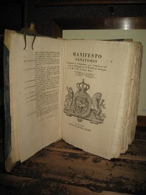 In-folio (310x220mm), legatura coeva in m. pergamena e punte con titolo manoscritto al tempo su tassello cartaceo al dorso. Alcune glosse di mano coeva al testo. Qualche sporadico alone. Ottimo esemplare in barbe. Raccolta di 78 editti, patenti, manifesti, proclami preceduti da 8 pagine di indice con 80 rimandi (mancano i manifesti del 1 e 2 gennaio). I documenti, molti con stemma sabaudo in xilografia al frontespizio, presentano un numero variabile di carte e vanno dal 4 gennaio al 24 dicembre 1822. Fra le materie trattate: ordine pubblico, amministrazione di boschi, selve e miniere, territorio, incremento di prezzi, navigazione interna, debito pubblico, dazi e tariffe, emissione e rimborso di rendite, ipoteche, corpo dei Carabinieri, mezzi di trasporto trainati, sanita' pubblica, atti notarili, scuole ed Università, assistenza pubblica, ecc. Manca al Manno.