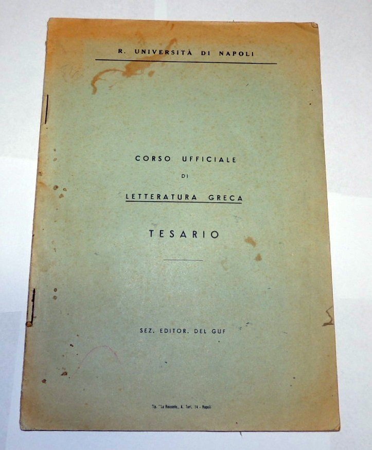 Regia Università di Napoli, Corso ufficiale di letteratura greca. Tesario, Sez. edit. del Guf, s.l. (Napoli?) s.d., pp. 24, cm 25. Minimi segni di lapis, tracce d'uso e strappetti alla copertina.