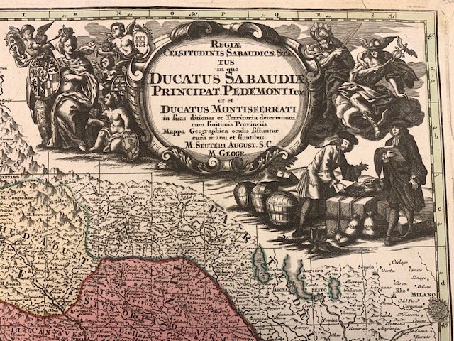 >Incisione in rame mm 500 x 570 arricchita da bella coloritura coeva. Titolo inciso entro grande ed elaborato cartiglio in bianco nero, raffigurante una scena mercantile, posto nella porzione superiore destra del rame. Nell'angolo in basso a destra sono riportate le scale grafiche "Milliaria Germanica communia 15 in uno gradu" e "Miliaria Italica communia". La carta ripropone, modificandone il cartiglio, quella di J.B. Homann, del quale Seutter era stato collaboratore. Matthia Seutter di Augsburg (1678-1757) fu allievo di Homann e ne continuò l'attività come cartografo, incisore ed editore di atlanti. Carta geografica dei territori del Piemonte e della Savoia Bell'esemplare con qualche piccolo strappetto abilmente restaurato nel margine superiore bianco. G. Aliprandi, Le grandi Alpi ( 2005), p. 288 (v. 1); F. Barrera, Il Piemonte nella cartografia del Settecento, n. 30 ; Torino e il suo orizzonte, n. 107 e n. 123.
