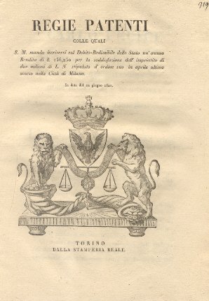 Regie Patenti colle quali S.M. manda iscriversi sul Debito Redimibile dello Stato un'annua Rendita di ll. 156,250 per la soddisfazione dell'imprestito di due milioni L. N. stipulato d'ordine suo in aprile ultimo scorso nella città di Milano. 22 giugno 1821.