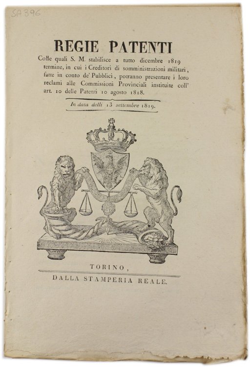 REGIE PATENTI Colle quali S.M. stabilisce a tutto dicembre 1819 termine, in cui i Creditori di somministrazioni militari, fatte in conto de' Pubblici. In data 13 settembre 1819.